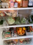 4. I found clean, plastic containers that helped to group things together like a) garlic, cut onion halves, ginger root and shallots into one container making them easier to locate when I’m ready to cook dinner; b) oranges, meyer lemon, clementines in another; c) root vegetables like turnips, parsnips, carrots and daikon unwrapped from plastic bags make them more visible and more appetizing to cook with; d) A handful of condiments we use everyday are grouped together in the fridge door (Hellmann’s, mustard, ketchup, sweet relish, pickles) and that’s all! e) sweet condiments (jams) and baking things (golden raisins, nuts) are in the left hand side vegetable crisper and f) salty, savory condiments (hoisin sauce, chili sauce) are in the right hand side crisper. Sweet and Sour in the fridge–who would have guessed it?