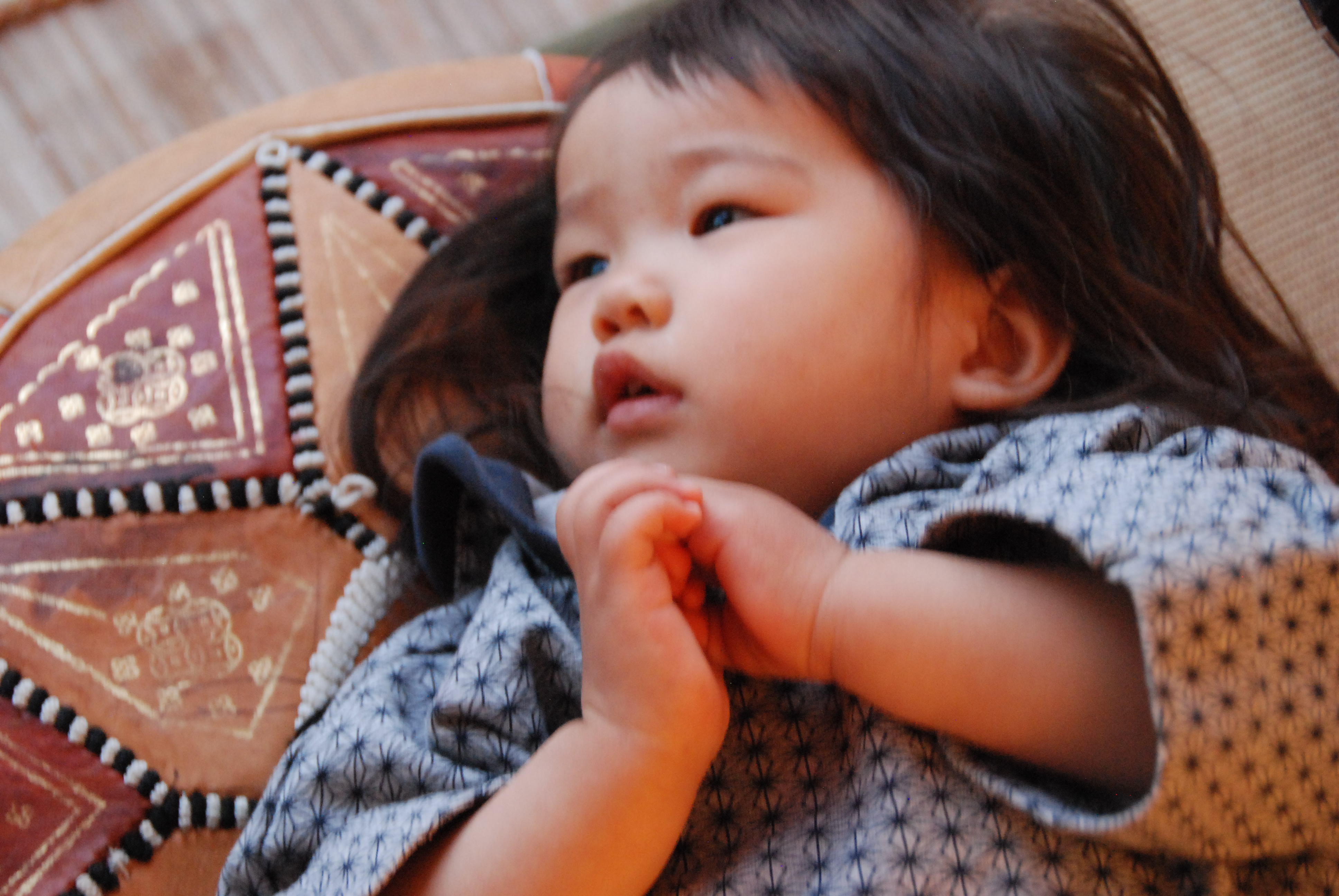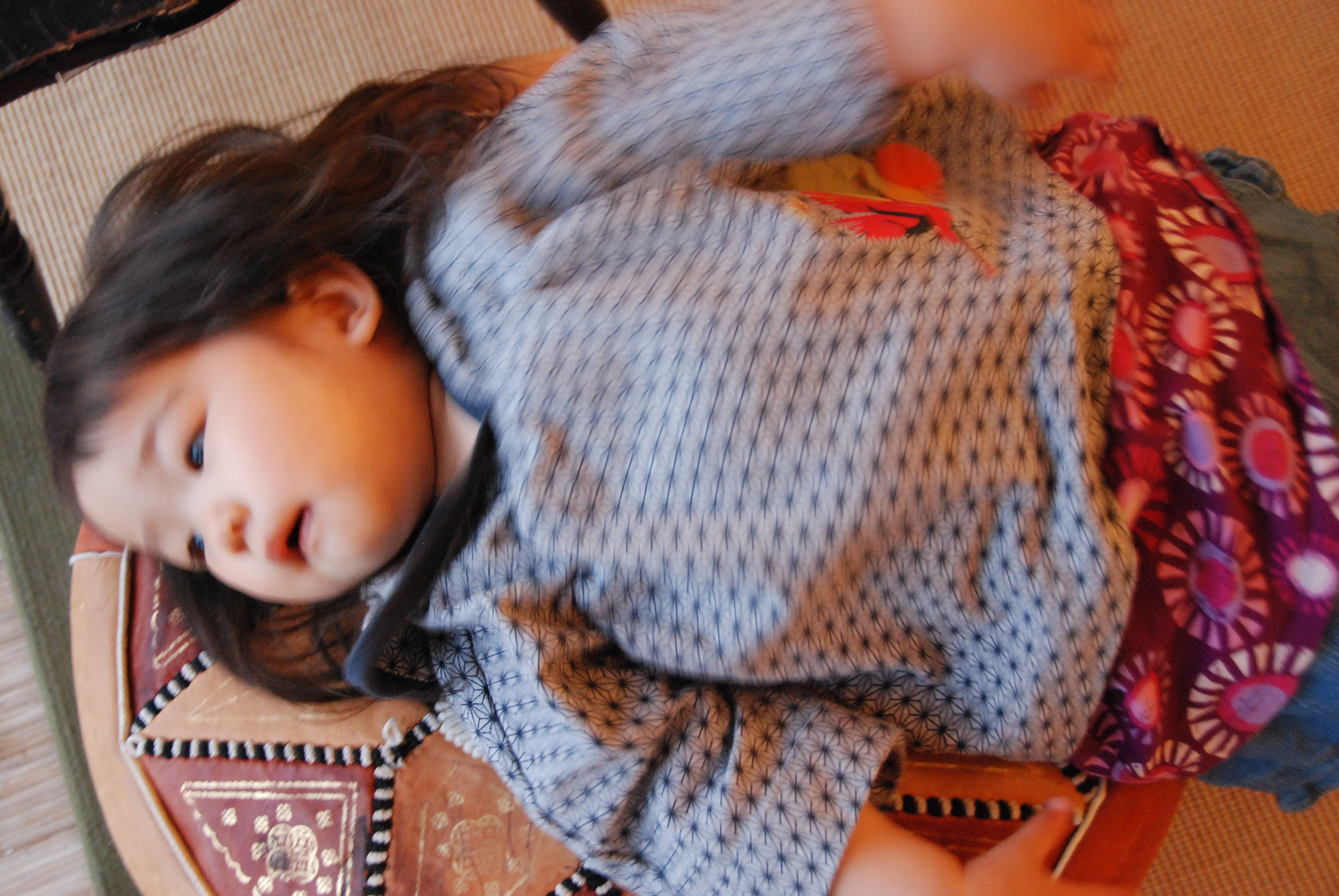 It’s lovely to see a young child take to something like this. BTW, I found one almost identical except for white triangles instead of brown on amazon.com! It’s leather and shipped flat so you can stuff it with towels and so on to make it pouf!