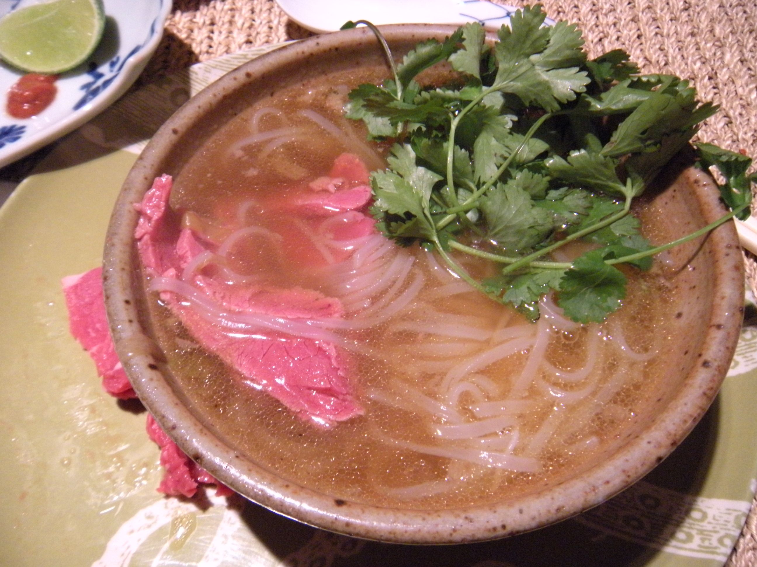 Sliced a rib eye steak into thin pieces (partially froze it first,) cooked the rice noodles; ladled the clarified stock, noodles and uncooked beef into large soup bowls, added garnish of basil and cilantro leaves. On the side were fresh lime wedges, siraicha and hoisin sauce (couldn’t find fresh bean sprouts today.) This Pho dish reminded me of a more elaborate version of Japanese shabu-shabu which is prime slices of beef cooked in water with vegetables and cellophane noodles dipped in a sauce which we had in Truro.