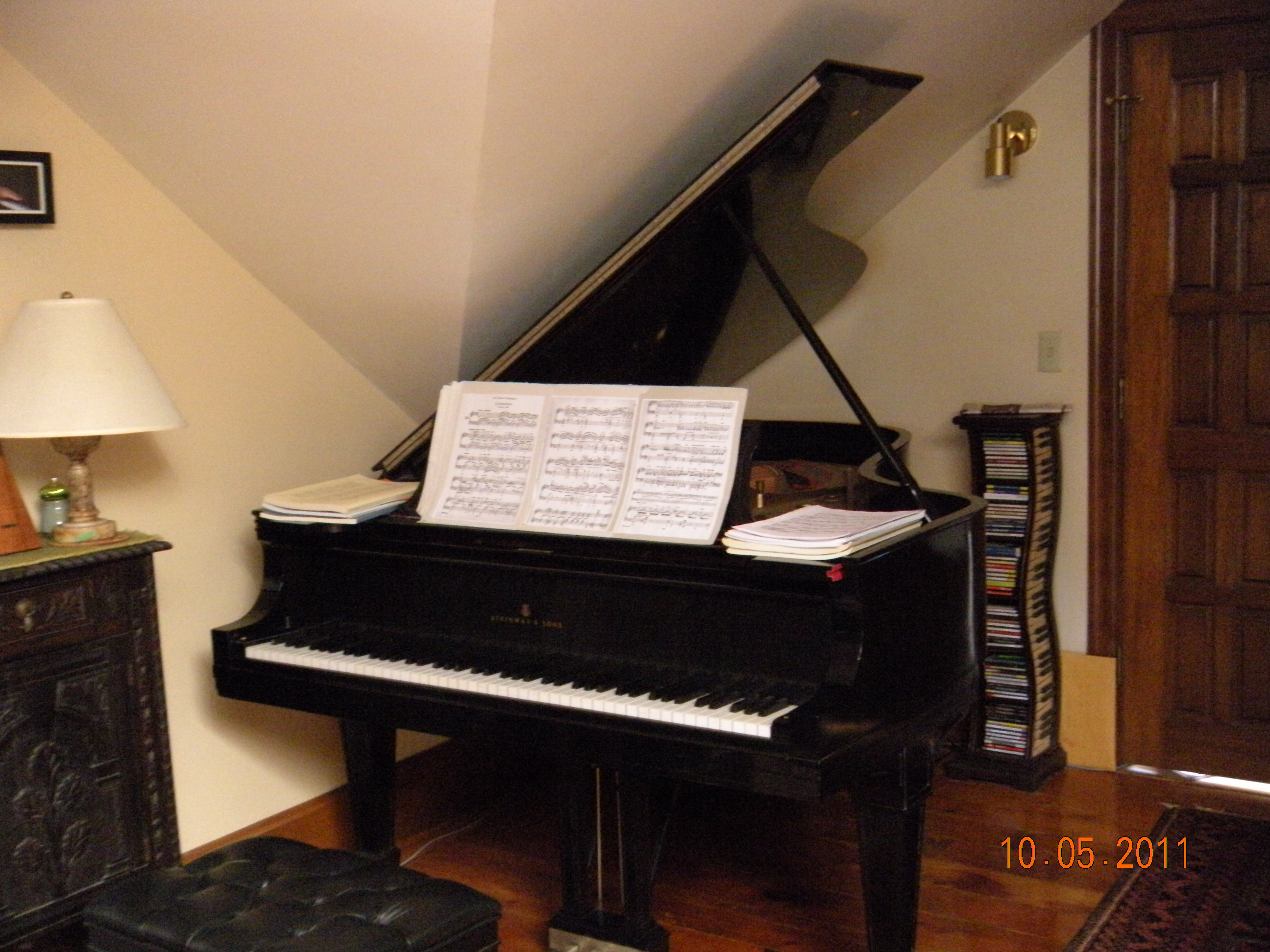 Fast forward some more to after the kids left home and I moved to where I live now. I traded in the Steinway “A’ for a Steinway “B” when I met my second husband, G. who rebuilt it. We named it “Victor” after the musician who had owned it previously. It has been and continues to be one of the finer instruments that have come through the shop. It used to be downstairs on the first floor where predictably, piano customers would happen upon it and want to buy it. So we hoisted it up to the third floor where we live, coming through the house from the outside deck. It sits in an alcove that enhances its sound without echoes.