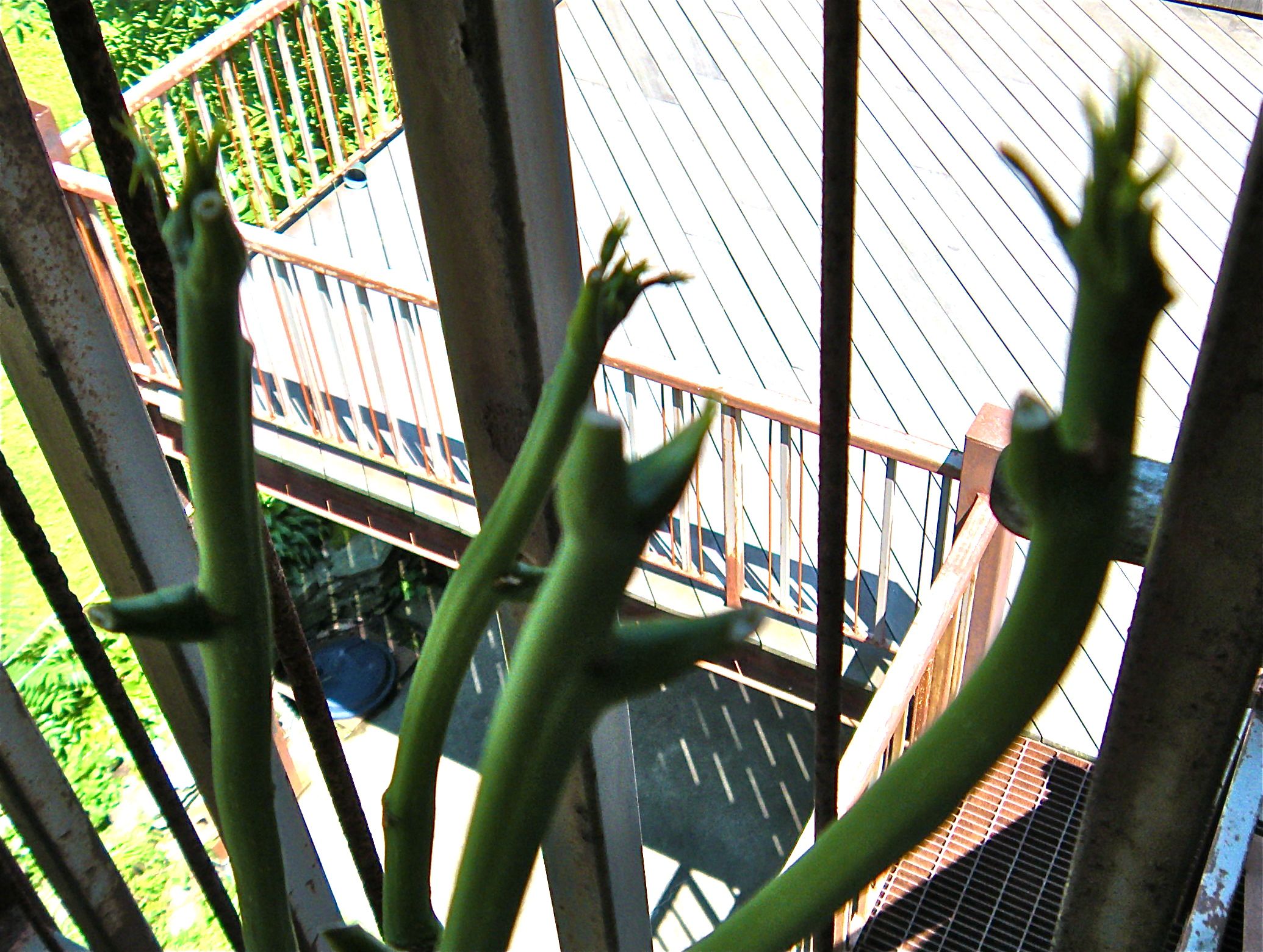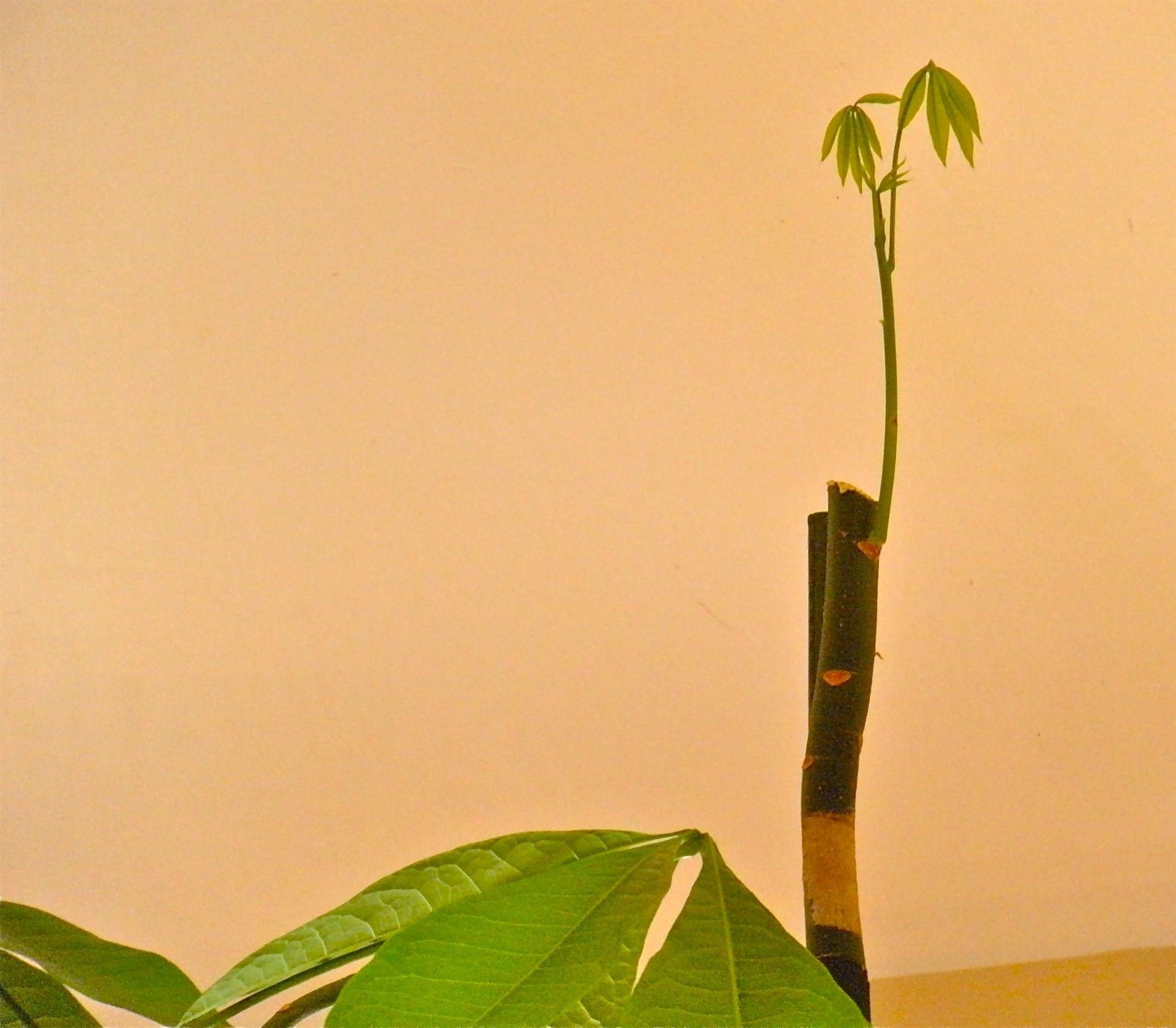 At the same time, the little sproutlet that emerged where the top was cut off shown above in this post last week has been growing an inch a day. I kid you not! It now has three leaflets on about ten inches of growth.