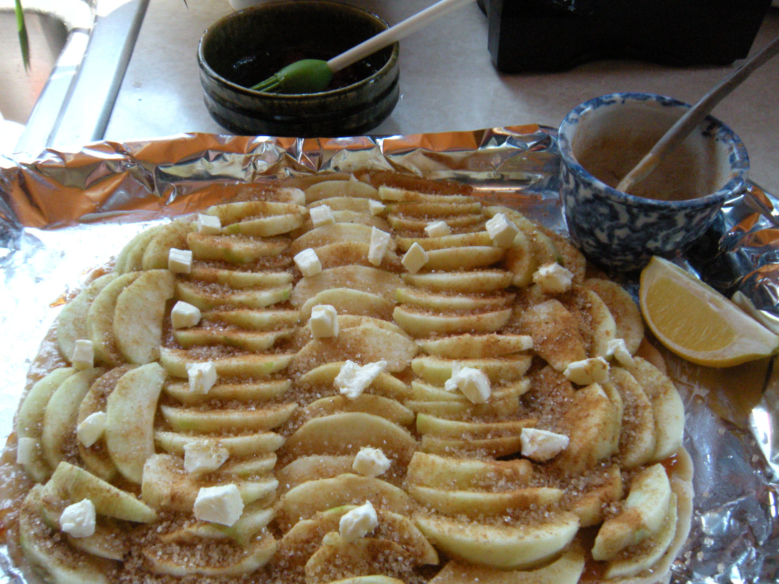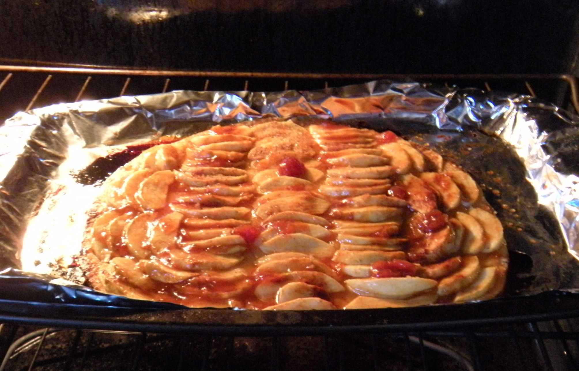 In any case, I wanted to make something with what I already had on hand: one Pillsbury pie crust in the fridge; three Granny Smith apples in the pantry and some peach/cherry/apricot preserves in the door of the fridge. I’m a fan of less crust, not more, so I’ve been making French tarts with thinly sliced apples, adapting Julia Child’s recipe but simplifying it with pre-made pie crust. These thin tarts are less mushy and require peeling only three rather than eight apples to fill a full apple pie. I butter the foil on the pan before unfolding the pie crust; then brush the crust with slightly warmed preserves on which to place the apples.
