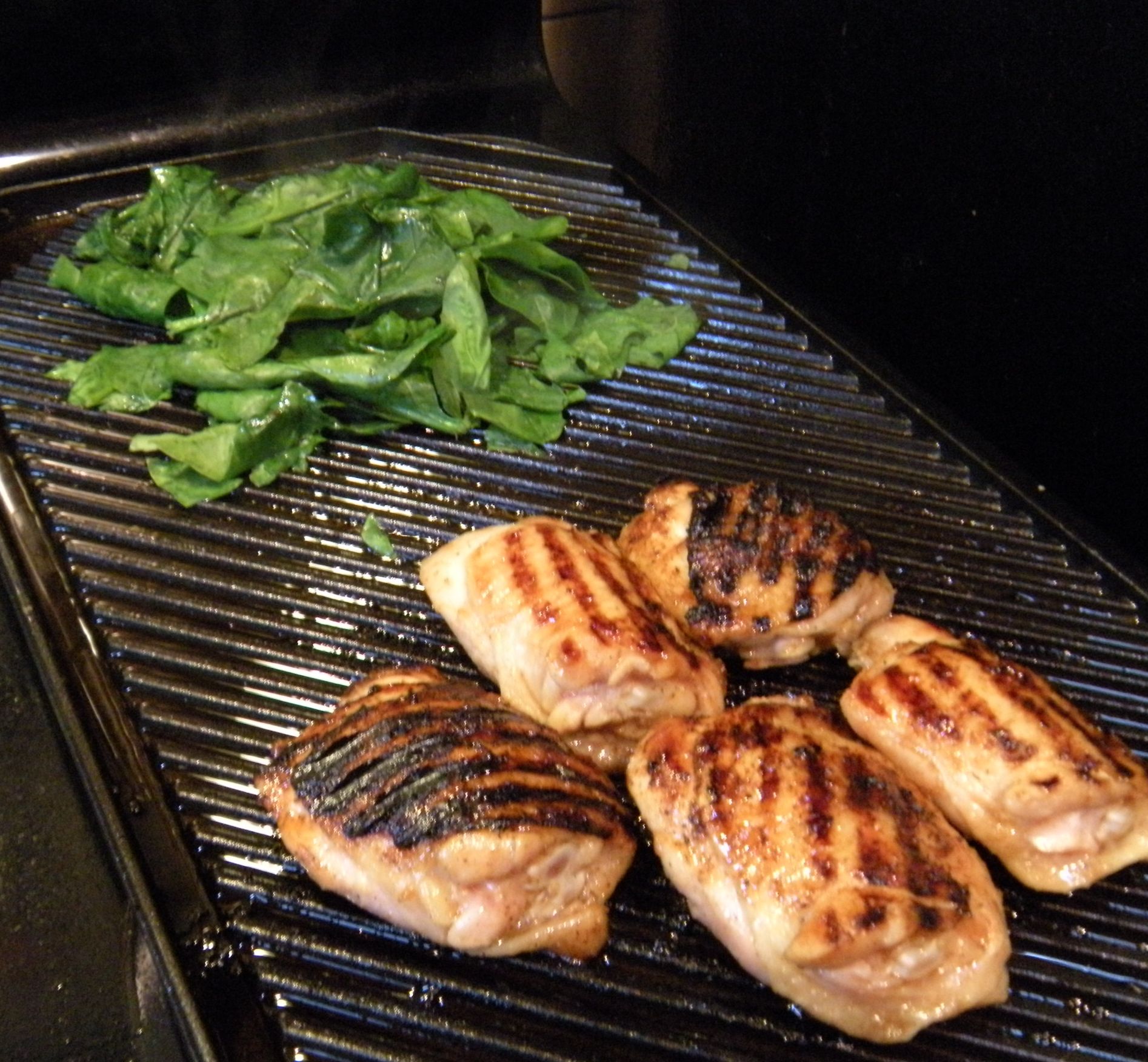 So I took my rectangular grill pan and set it on two burners. I really like this piece of equipment because you can cook food quickly on it and it makes those nice grill marks on the food afterwards. All we’re missing is the flavor of mesquite. For our other course (remember, just two a meal,) I’ll pan fry some fresh spinach until it’s just wilted, turn off the heat, dress with a little organic Ohsawa soy sauce and a squeeze of fresh lemon juice.