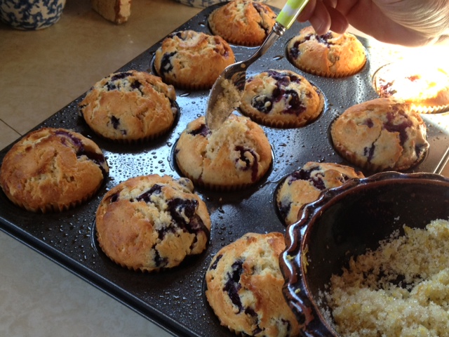 This weekend, my daughter, C. visited and we made blueberry muffins because it was Sunday morning. A new recipe I found online with small bits of unsalted butter mixed in with the flour, sugar, baking powder and salt. Then eggs and milk. Blueberries and orange zest. Baked and sprinkled with lemon zest and sugar on top: the crowning glory of flavor. They were delicious, especially with cups of hot coffee while we read articles aloud to each other from the New York Times. Not too big like supermarket muffins sometimes are. C. remembered when we used to make blueberry muffins from Duncan Hines box mixes on Sundays when the kids were growing up. I forgot about that somehow.