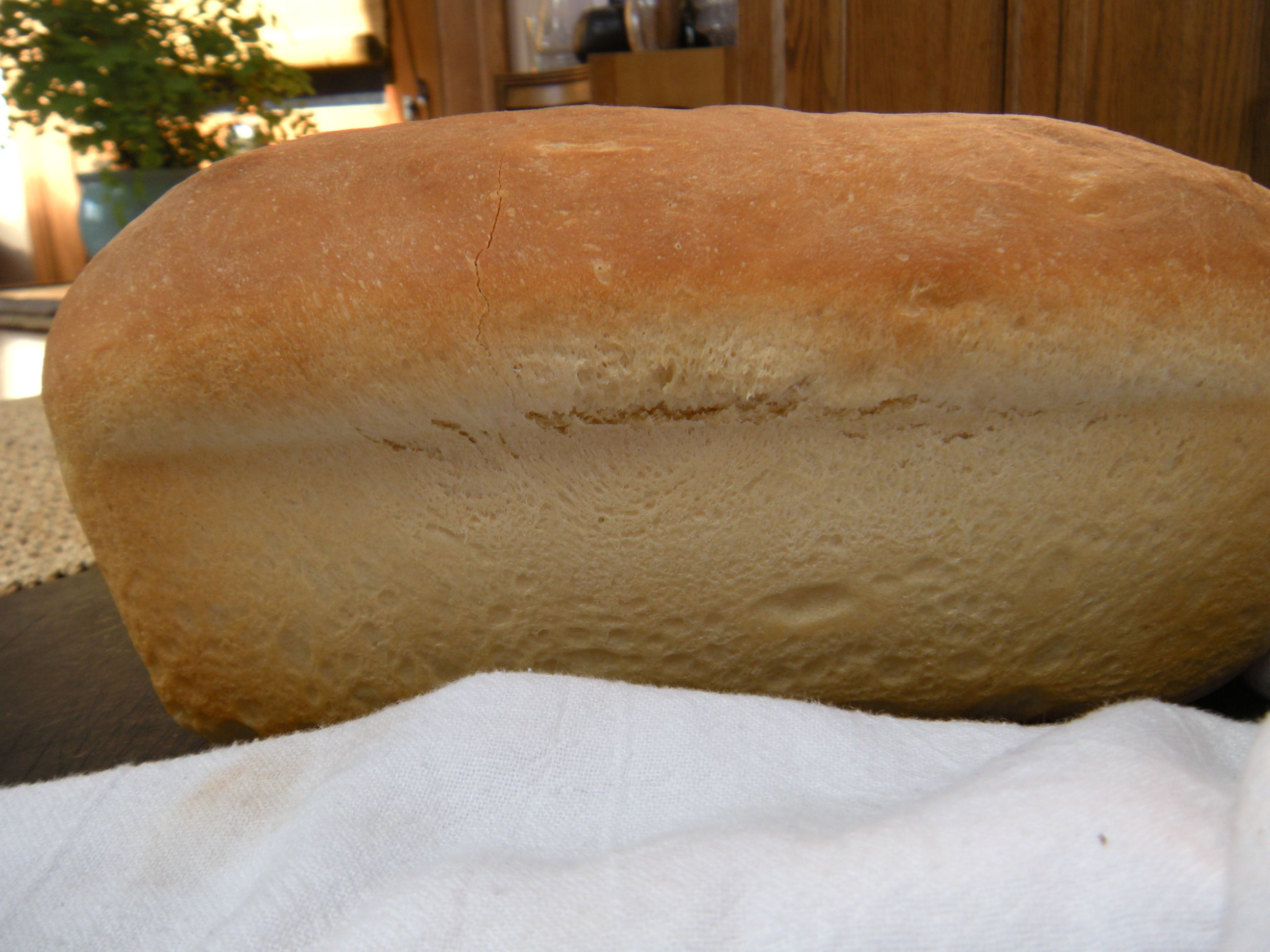 I hand kneaded the bread dough for exactly ten minutes even though I was tempted to stop after five minutes. I heated my oven, then shut it off, placed a bowl of water in it and added the dough in a greased bowl to rise for the first time. After the dough rose the first time, (after a 2nd boost of hot air two-thirds of the way through,) I punched it down gently, formed it into a loaf with minimal handling and put it into a buttered (not greased) white stoneware Le Creuset bread pan (my all-time favorite baking utensil.) Heated the oven again and turned it off, added a pan of water and let it rise again with a film of plastic on it. When risen, separated the plastic without disturbing the dough. Then I boiled a small pot of water. Pre-heated the oven to 350 degrees. Opened the oven and poured the boiling water into a pan next to where I was going to bake the bread. Closed the oven again to let the inside oven temperature rise again to 350 degrees. Popped the bread into the oven and let it bake for about 30-35 minutes. Took it out, gently ran a knife around the corners and it came out easily, the steam permeating the kitchen with wonderful bread aroma.
