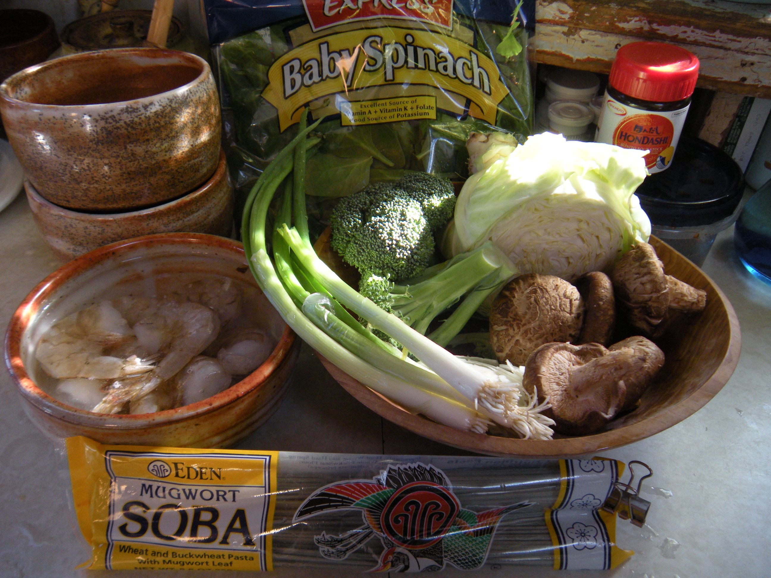 So, here’s what I think I’m going to make: leave the shrimp in their shells, dry them and saute them briefly with garlic, ginger and scallions with a little teriyaki sauce added just at the end. In a separate pan, saute sliced shitake mushrooms with broccoli and shallot, chopped thin. Make a dashi broth and add a little teriyaki seasoning. Cook the soba noodles in boiling water and drain well. Slip the soba noodles into individual large soup bowls filled with the dashi broth and fresh baby spinach. Serve the shrimps on the side to be eaten in their savory sauce.