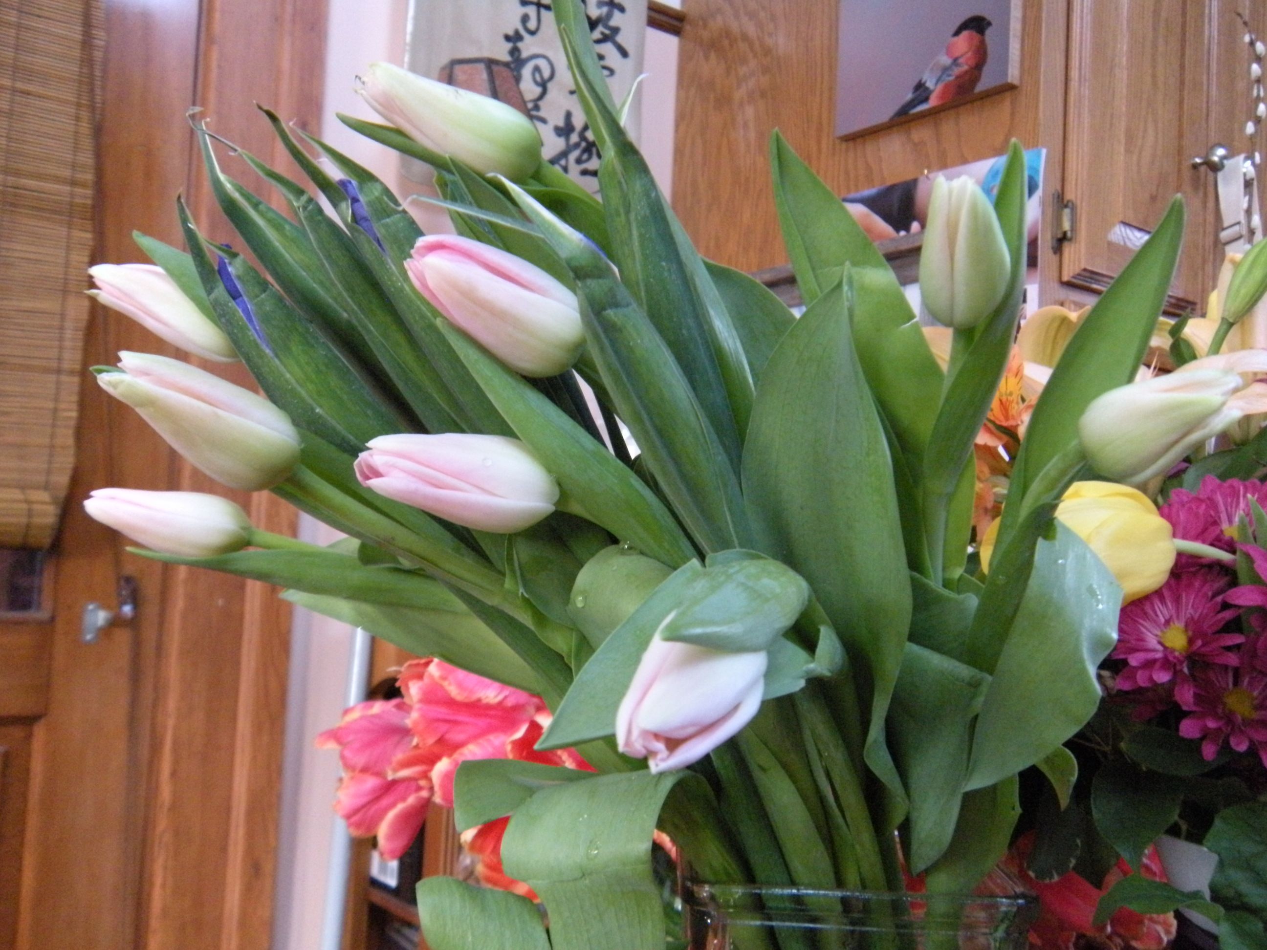 Today, surrounded by beautiful flowers from well-wishers, I am biding my time until the surgeon operates on my foot next week (week by week it seems to go.) After lunch, I managed to use a walker to stand at the kitchen sink and wash my hair. It’s getting long, I keep telling myself as I comb it out and twist it securely on top of my head to dry in the sun while I sit and rest my leg.