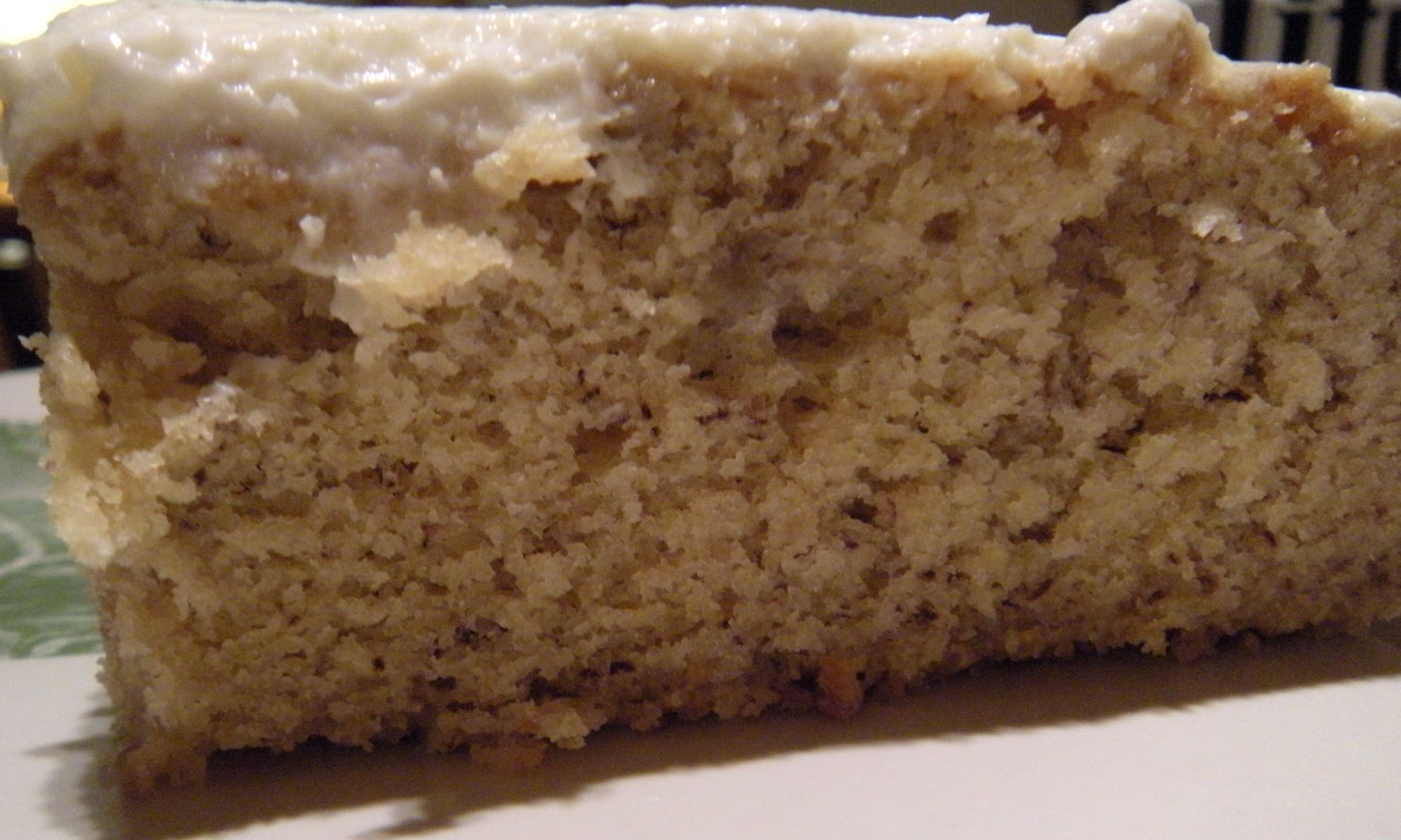 Honestly, the recipe took a long time to prepare. I followed it to the letter including adding fresh lemon juice to the bananas and alternating the dry and wet ingredients culminating with the bananas at the end. The frosting always turns out well–I resisted adding either lemon juice or vanilla, wanting it to be rather austere in its cream cheese-ness. I’m curious to see what kind of alchemy the freezer cooling step produced and will let you know in a little while.