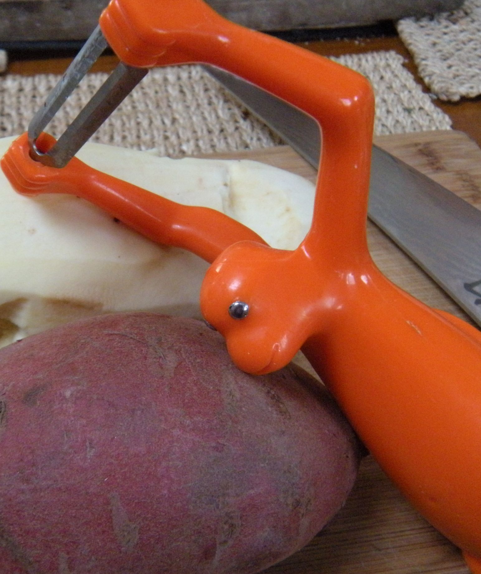 One of the things we most enjoy eating is Japanese sweet potatoes. Have you ever tried them? They have a thick red outer peel and a white/yellow very sweet interior. Once you taste them, it’s really hard to go back to the more commonly found yams, sweet potatoes or even garnet yams. Sometimes these Japanese sweet potatoes are found in smaller sizes, just right for a single serving at dinner. Other times, these tubers come in large sizes and seem too large to bake. All of these comments are by way of introducing the idea that tonight, I’m going to try making Japanese sweet potato FRIES!! Peel the red outer skin off; use the large Samurai carving knife to cut the peeled potatoes into slivers, dress in vegetable oil and sprinkle with Maldon salt. Preheat the oven to 450 degrees and bake until crispy, golden brown.