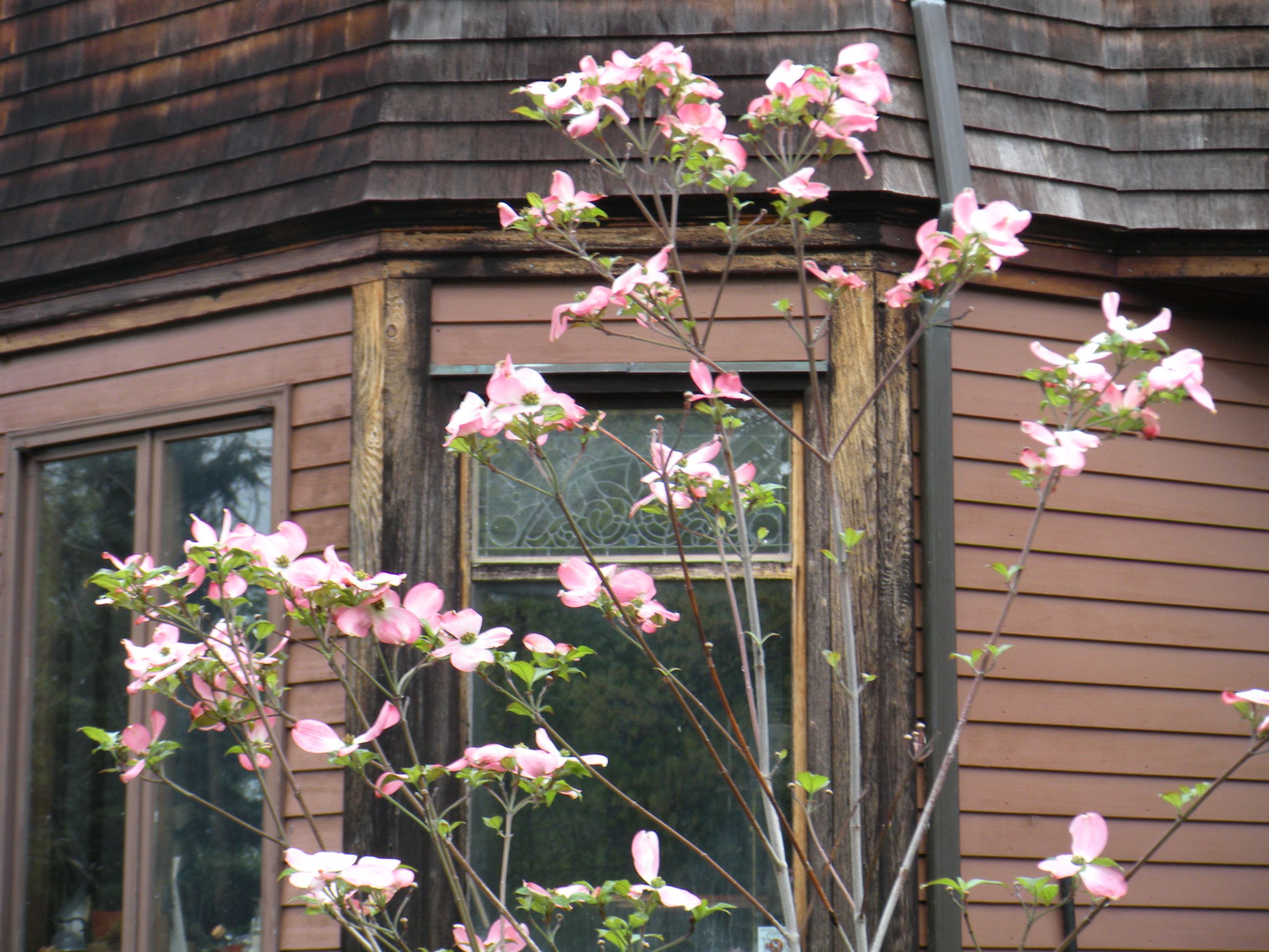 I did some research on replacement trees and made the rounds of some nurseries in the towns nearby. Flowering pear trees appeared alongside the post office, white and fluffy for awhile but were uninteresting to me. Down the street a ways was a mature coral dogwood tree whose branches had filled out bearing flowers, both lovely and modest. I went to Lowe’s on the suggestion of a neighbor down the street and came across two six foot high dogwood saplings for $29.95 each. I bought them both and carted them home in my Subaru wagon. Into the ground they went here and also across the street. Then, we wondered aloud how long it would take before flowers might appear on the small trees.
