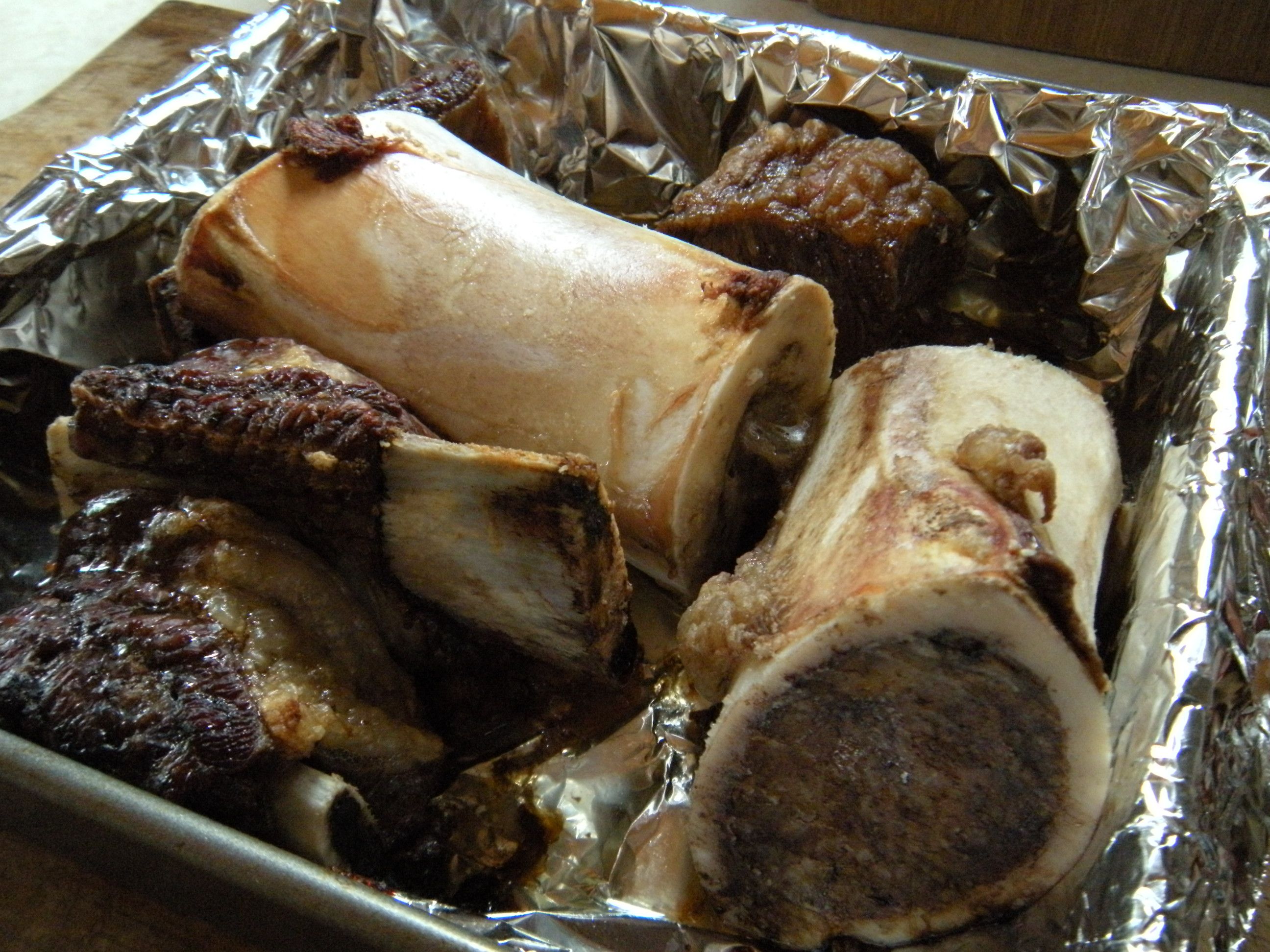 The beef short ribs and bones roasted in the oven at 375 degrees for about an hour.
