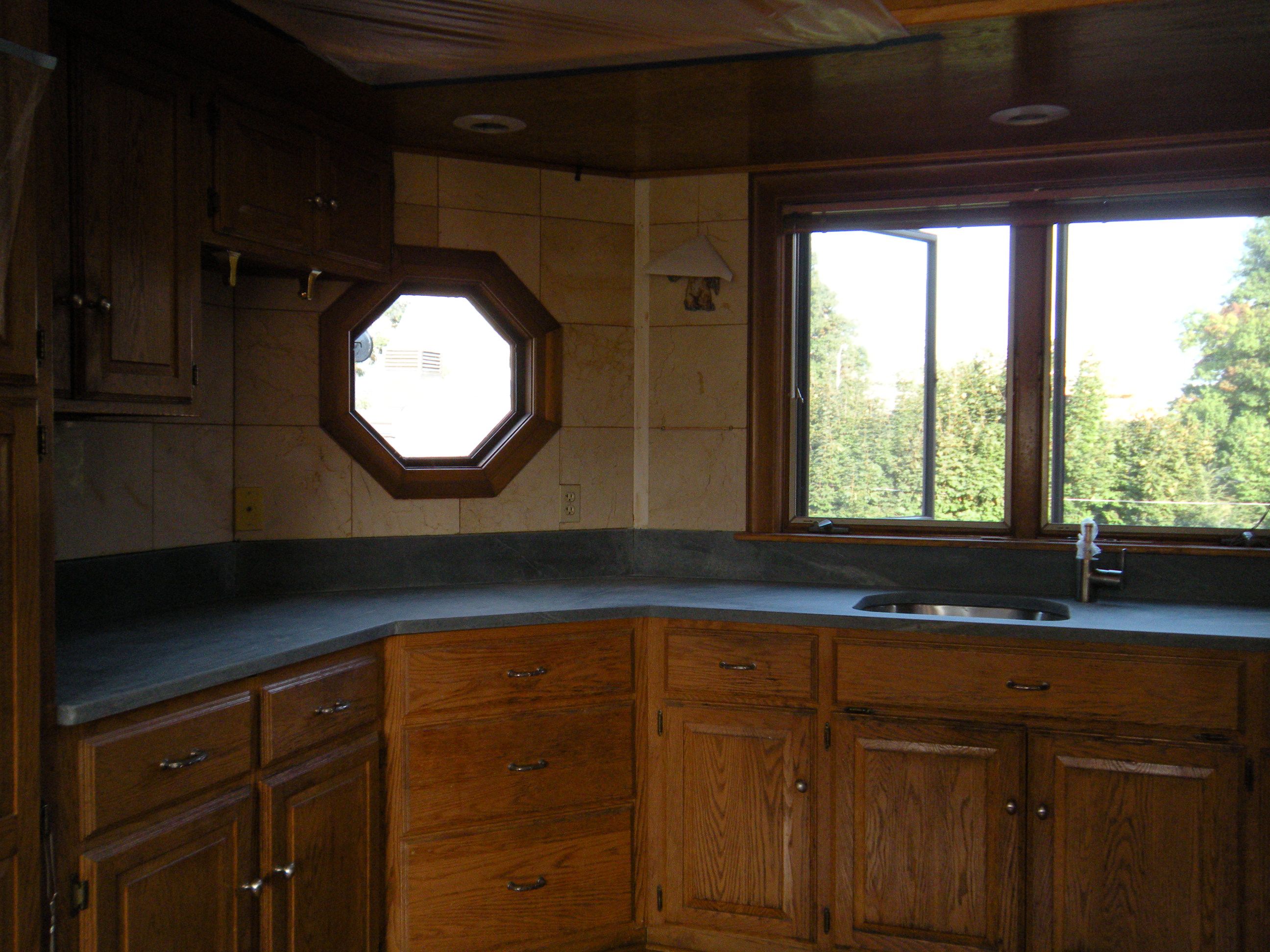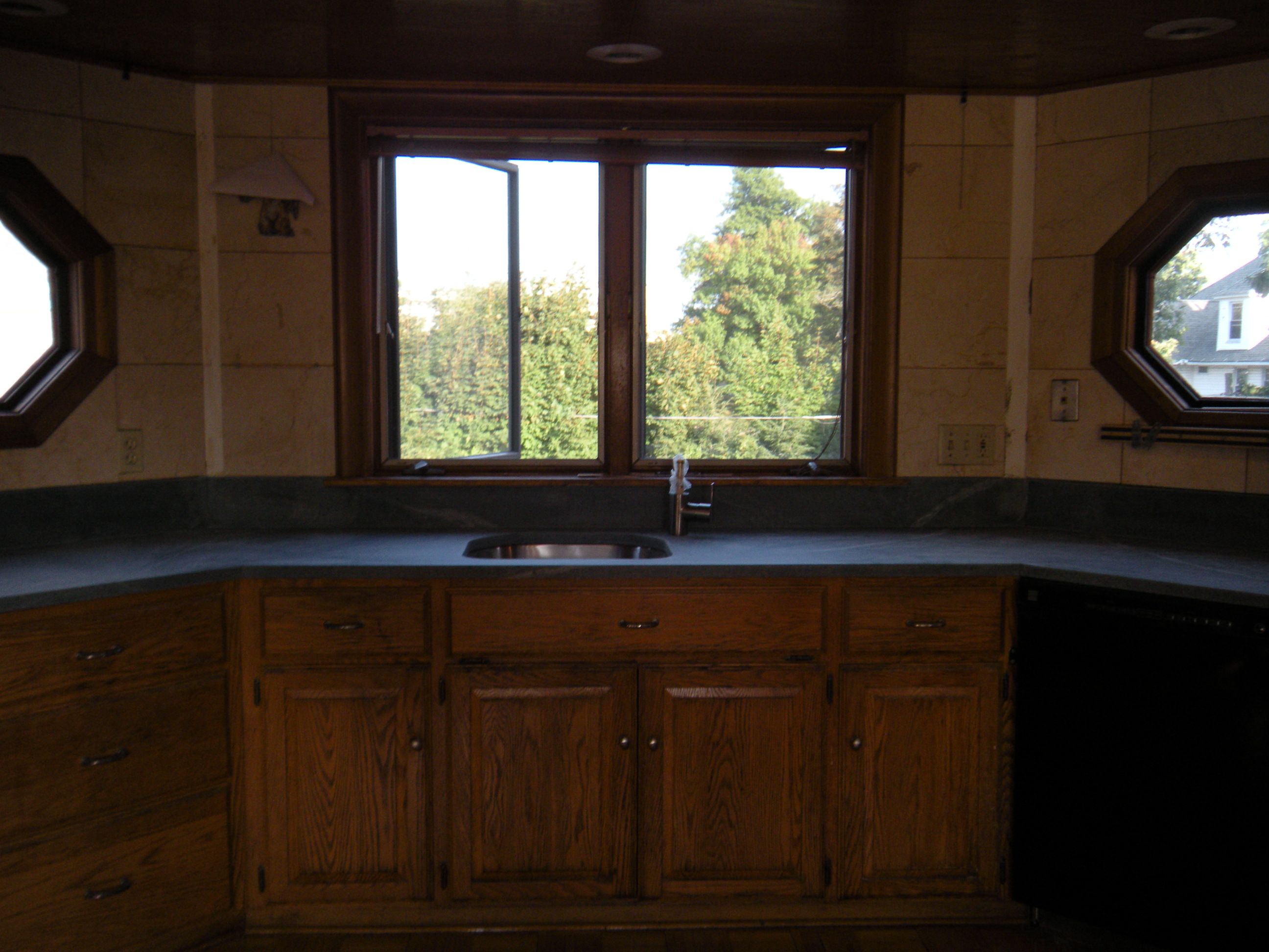 Here are a few photos of the raw soapstone countertop, completed but unwaxed. Photos of the finished countertop will be posted soon.