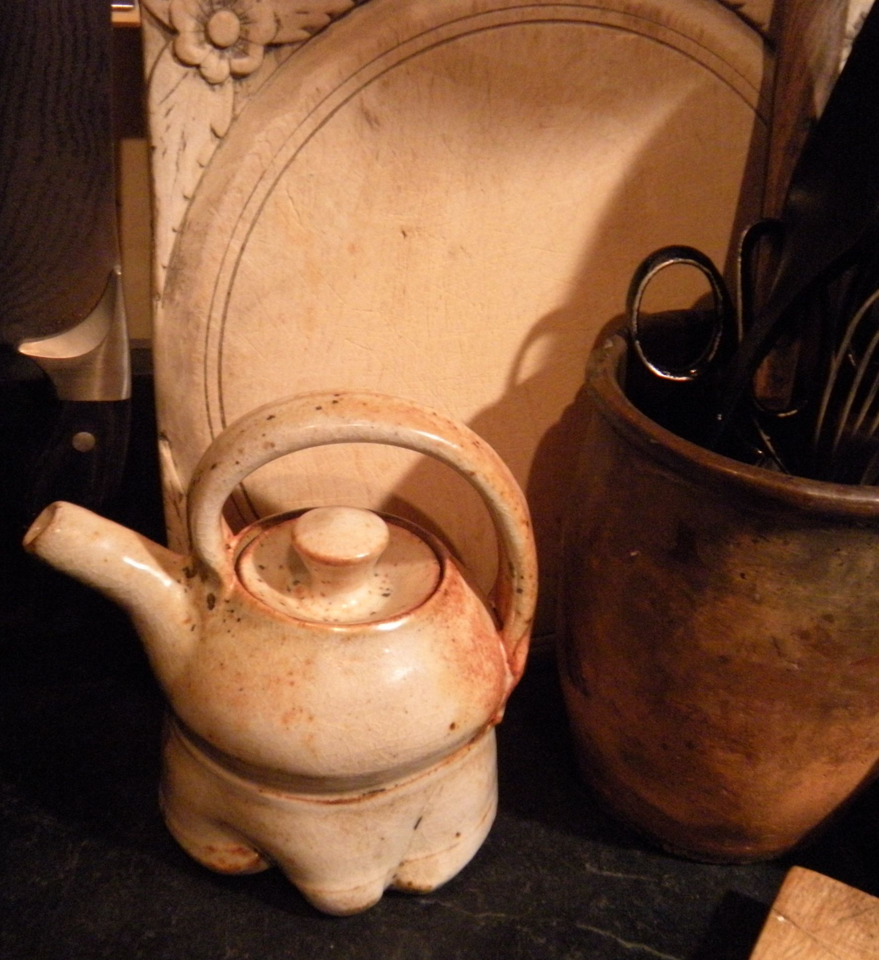 This morning, I washed all the soffit pottery (old and new) that I’ve collected over thirty years. The huge New England wooden bowls went back up on the top shelf where they have watched over us for as long as we have been together (>21 years!) One of the bowls was the first thing I ever bought at auction for fifteen dollars when I first moved to New England and became an antique dealer. I’ve sold many collections since that time, not needing to hold on to them as such, but keeping one or two things–okay, maybe three or four (redware) that are my favorites. Actually, I enjoy having a few things that I absolutely love than collections of things. Like this old carved, bleached out breadboard.