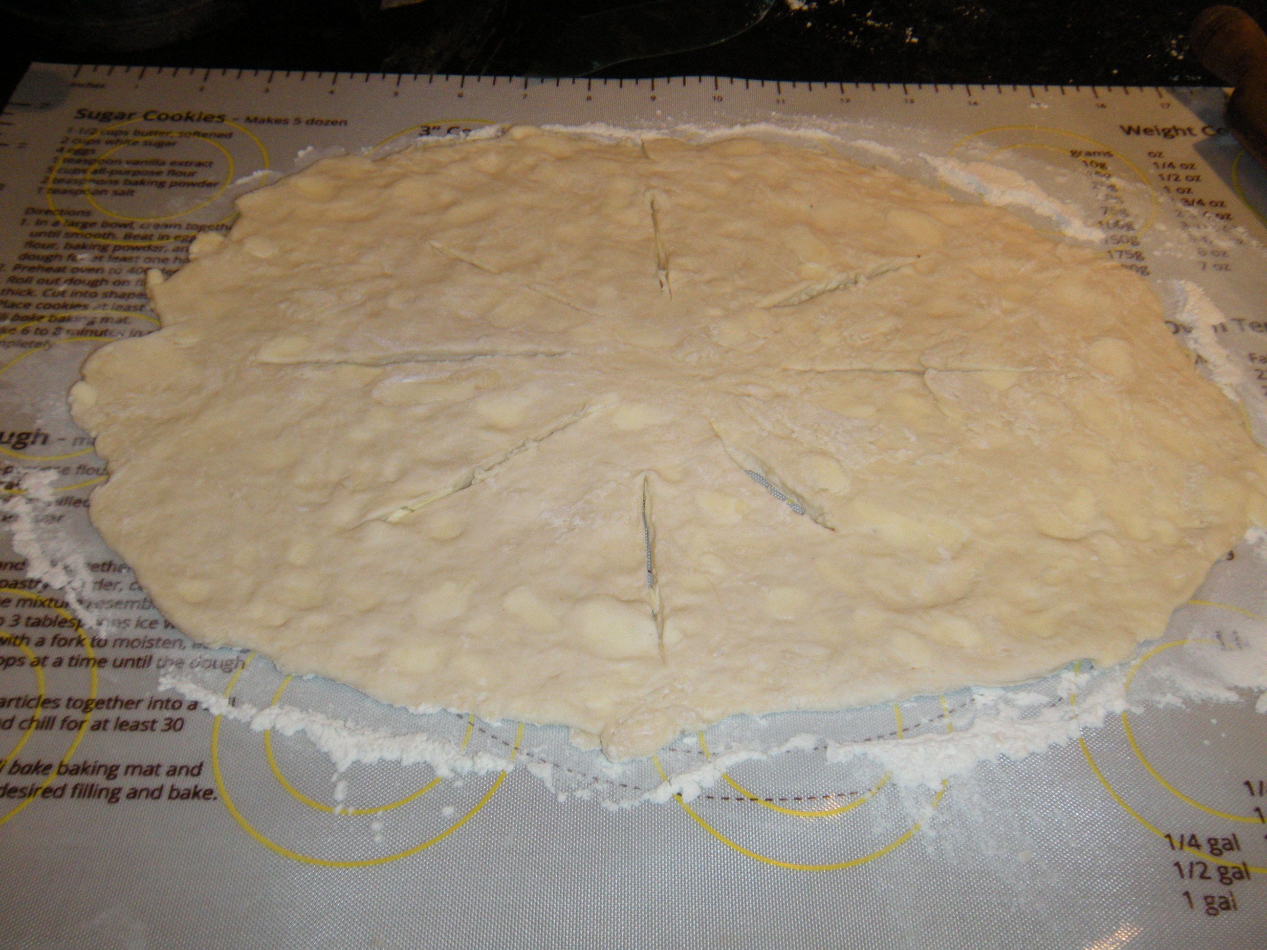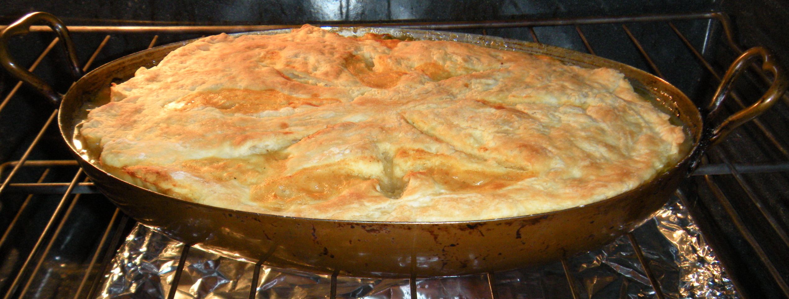 About forty-five minutes before supper, I heated the oven to 400 degrees, brought the pot pie in its copper au gratin pot to a bare simmer and rolled out the crust, using the cold dough from the fridge. I added the chunks of mushrooms to the chicken mixture and gently fitted the crust onto the top of the pan. Into the oven it went for about half an hour plus or until the top of the crust became golden brown and the biscuit top cooked through. I made slits in the buttermilk crust to allow steam to escape and put a baking sheet lined in aluminum foil underneath just in case the gravy dripped into the oven.