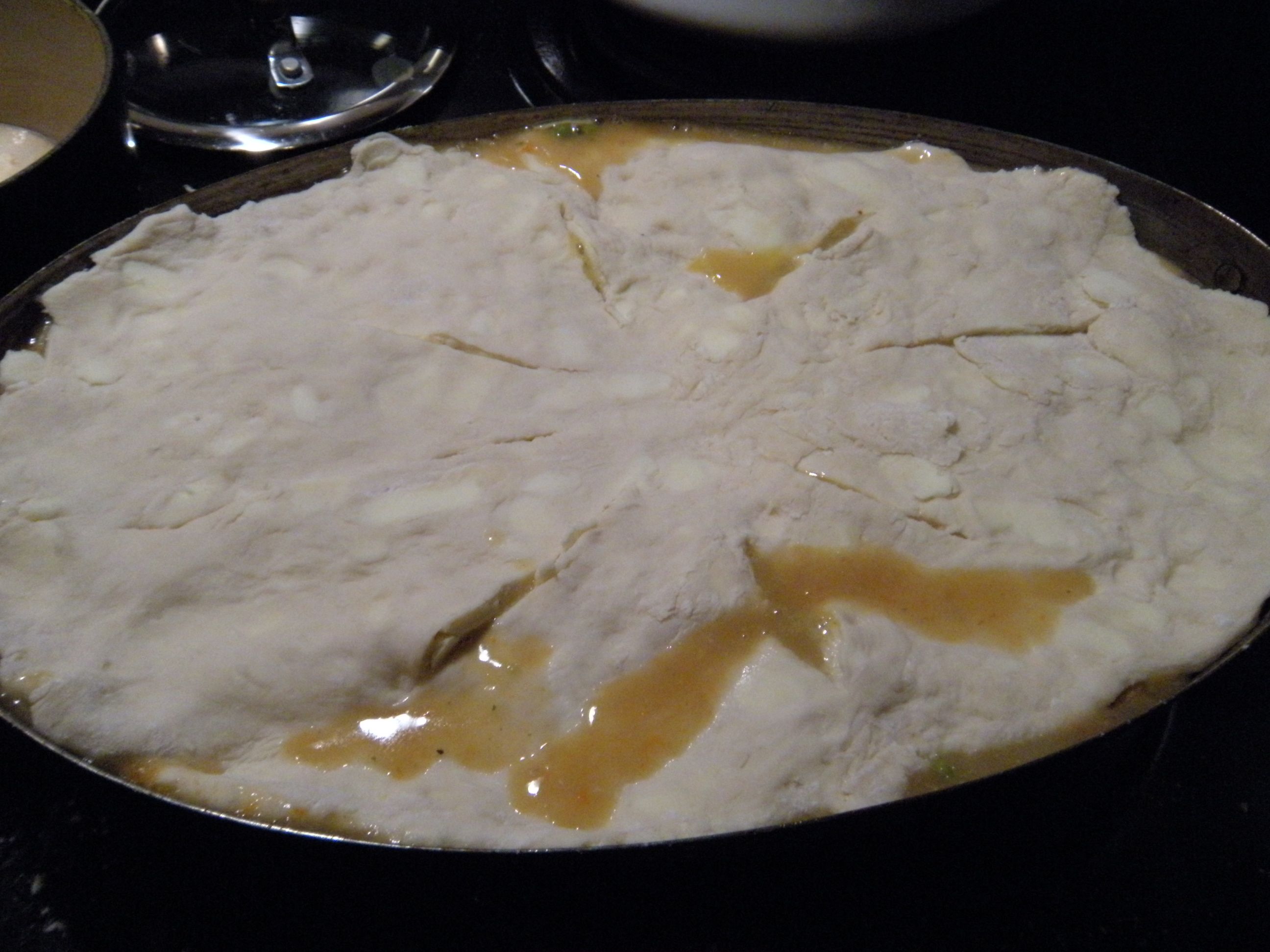 Another important part of the recipe (learned the hard way) is to heat the chicken filling very gently to make sure it’s bubbling when put into the oven AND that there’s enough broth/gravy for the biscuit crust will absorb. So just to be sure, I made some more stock, added it and allowed it to cook down in the chicken casserole just barely simmering on top of the stove.