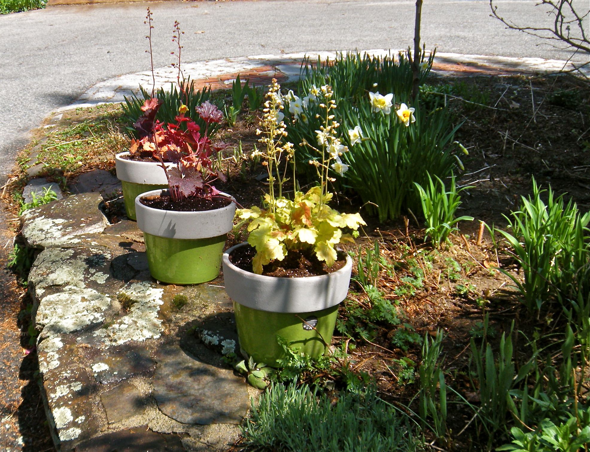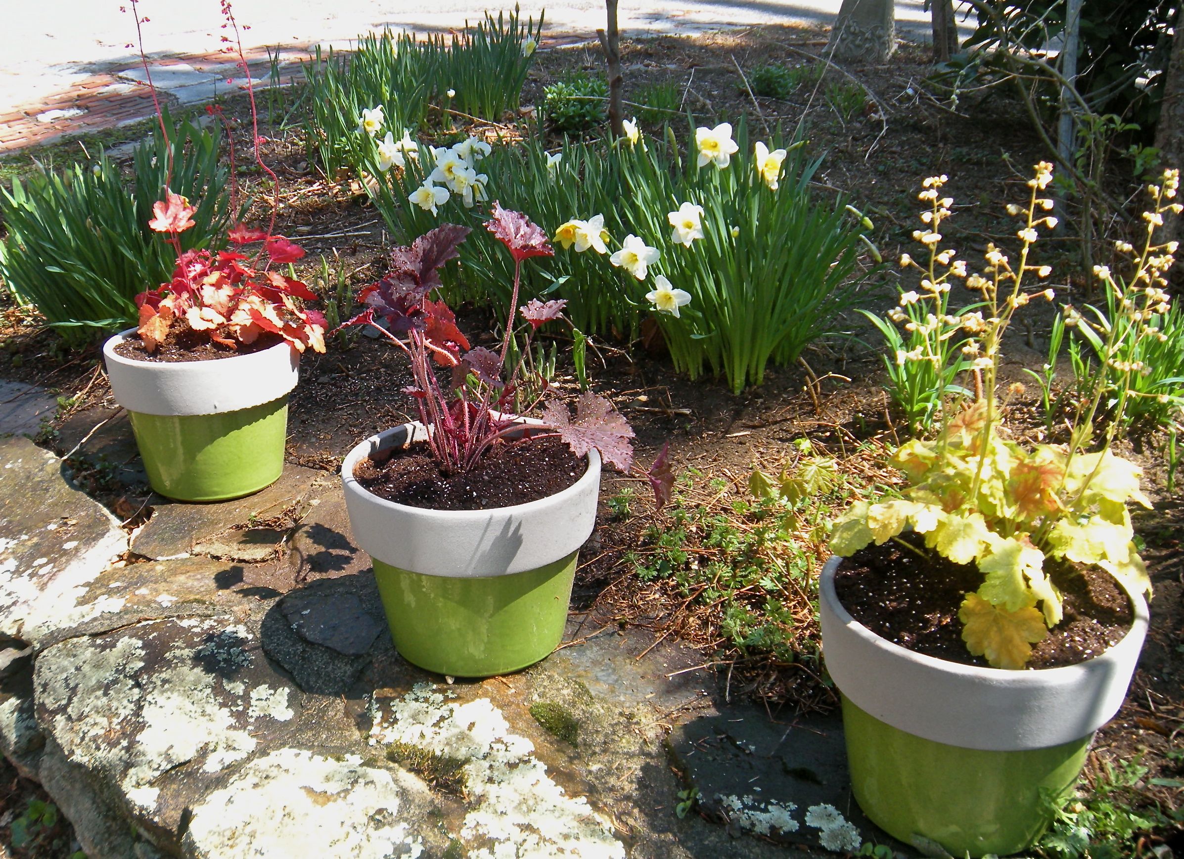 The spring ceramic planters I bought at Lowe’s are filled with dramatically colorful heuchera plants whose leaves contrast with each other against the green of the pots. Coral bells have always been some of my favorite kinds of plants because of the unusual colors the leaves are (chartreuse, light orange and deep maroon) their stems of tiny coral flowers swaying in the breeze.