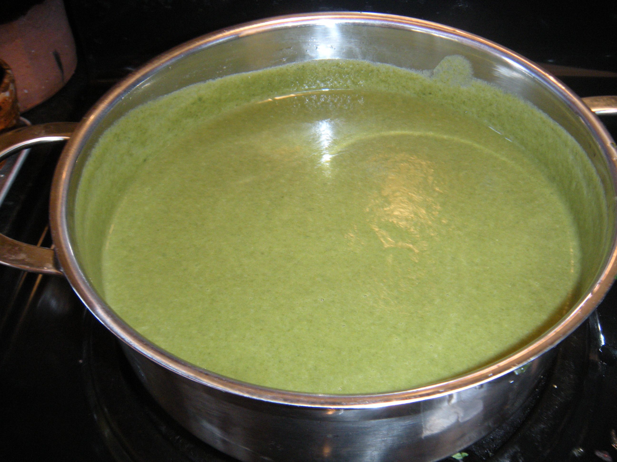 Yesterday, I made a simple vegetable soup (onions, celery, carrots, broccoli and diced tomatoes simmered in homemade chicken stock from the freezer) that we shared with G.’s mother and brother across the street at lunchtime. It was a warming treat during a grey, drizzly, cool day. Today, I was thinking about how meager our lunch choices were and thought about making the soup again. Instead, I looked around and discovered some fresh spinach that was looking a little sad but still good, so I looked online for a spinach soup recipe and found one that incorporated a sweet potato too!