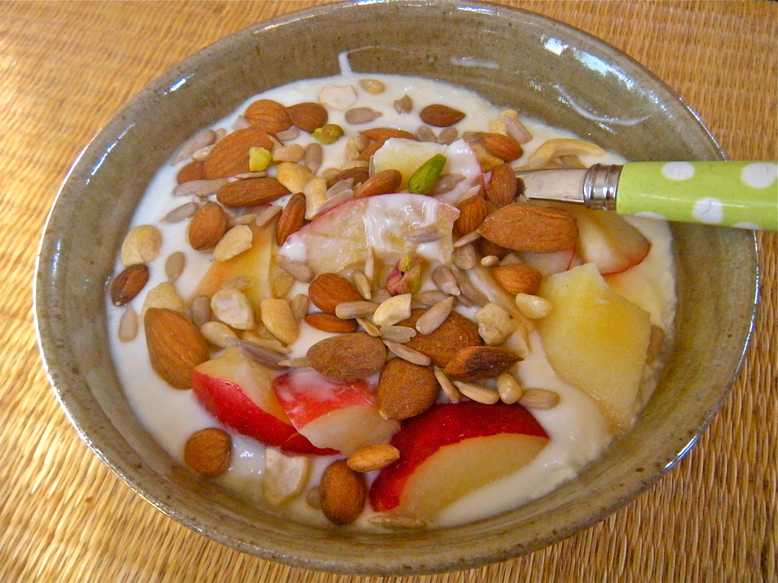Into a pottery dish, I spooned out organic whole milk yogurt (with luscious cream topping, I must admit.) Rinsed off a small white nectarine and sliced it, adding a generous sprinkle of nuts on top. I didn’t add any honey because the fruit was sweet enough.