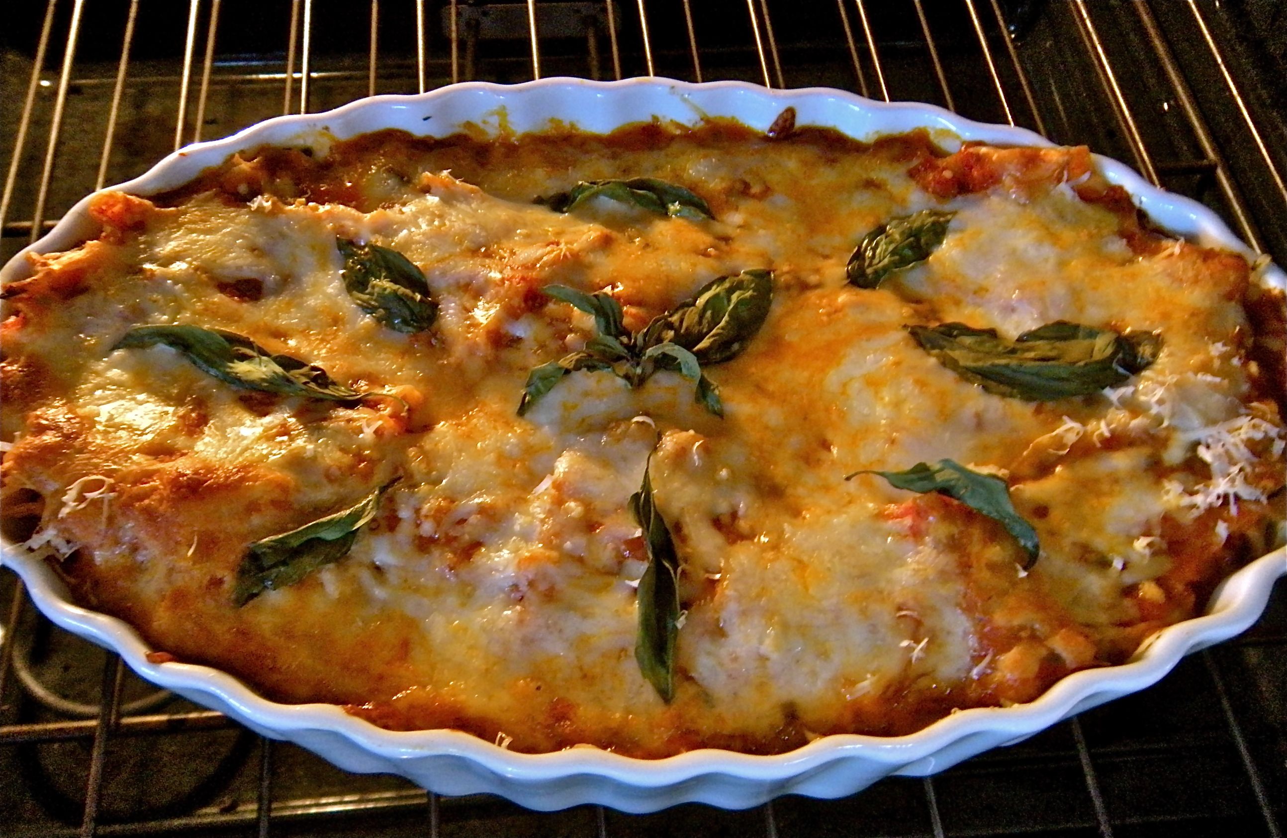 So this morning, as a prayer of thanks to the Universe and the Helpers who were there to make sure I didn’t get in an accident in my rash haste to make it home, I decided to put together what I call a “gratitude lasagna.” It’s ingredients include whole wheat lasagna noodles, a jar of light tomato sauce with herbs that I had bought on sale at the market, half a bag of thawed spinach (water squeezed out) sauteed with some butter and scallions, slices of bella mushrooms sauteed in butter; whole milk ricotta, mozzarella cheese and aged parmesan reggiano cheese that I grated on the microplane. To top it all off, florets of fresh basil leaves from the kitchen planter on the back deck.