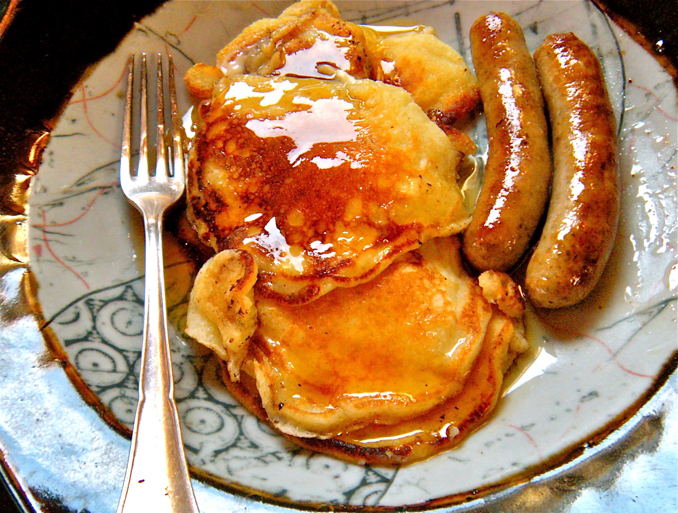 Mix together by hand and cook the pancakes in the skillet that was used to melt the butter. Heat up some Jones country sausages in another pan until golden brown. Serve with butter, pure maple syrup and cups of hot coffee.