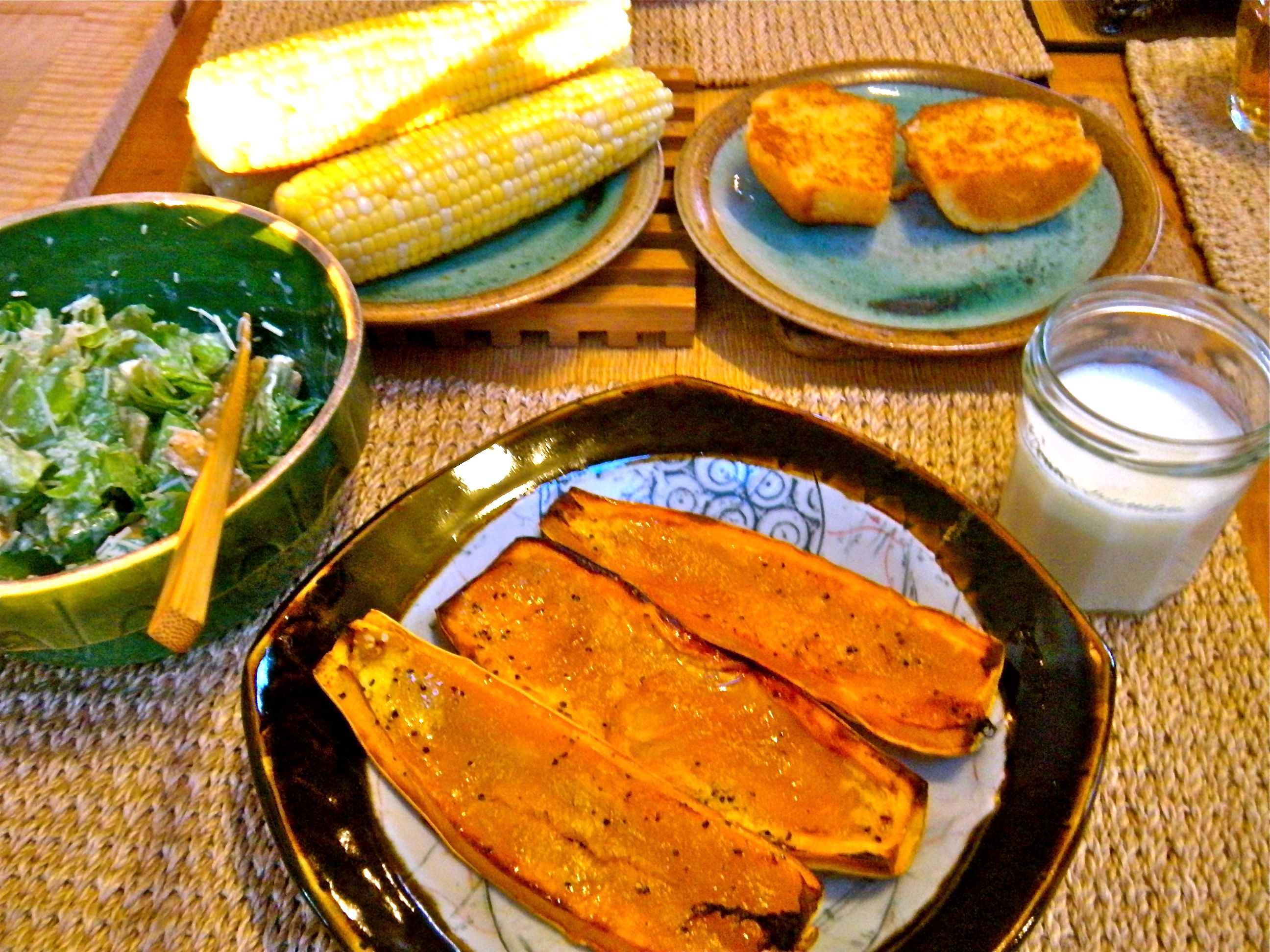 We’ve had a couple of these meals in his honor already, and for some reason, I thought it would be nice to have it again tonight. There’s a delicata squash roasting in the oven with a maple/butter glaze permeating our kitchen with a delicious fragrance. Fresh corn on the cob and a caesar salad with croutons. A heated corn muffin in the skillet and a chilled glass of buttermilk.