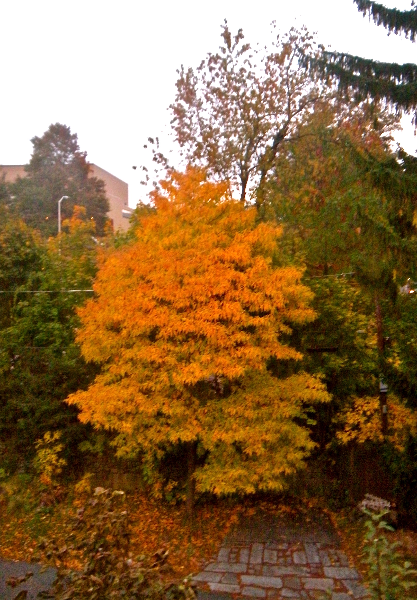 Fall arrives when the Sassafras trees in our yard turn color. These photos were taken this morning from our bedroom window. They are even more striking when the sun is out, but I like the deeper contrast in the early morning light. We’ll be raking leaves in a couple of weeks!