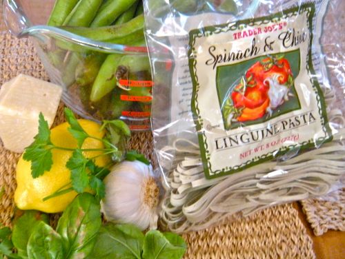 ingredients: fava beans, fresh garlic, basil, parsley, lemon & Trader Joe’s spinach-chive linguine. . .