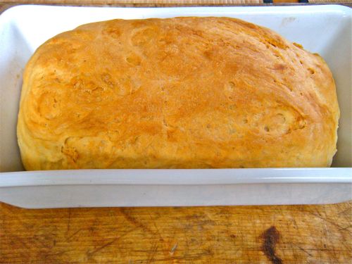 Because I didn’t have a lot of flour in the cupboard, (I had about 3 cups plus a little instead of 3.5 cups plus a little,) I reduced slightly the amount of liquid and other ingredients to accommodate for a smaller loaf. The first round of dough rose mid-morning in the oven, warmed by turning on the oven light. It’s amazing how much warmth that little thing gives off!