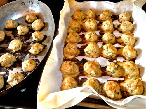 - Mixed everything gently together with my hands; formed walnut sized meatballs and placed them on baking sheets spread with olive oil. Be sure to spray the sheet before putting the meatballs on it – otherwise, they stick like glue when they’re baked!