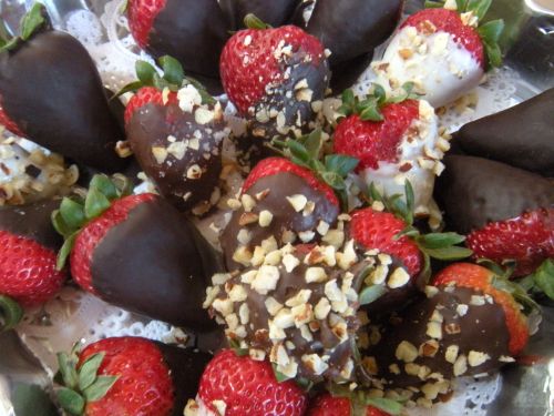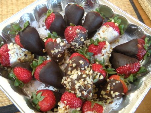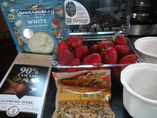 Here’s how they turned out: the intense dark chocolate was so dark it was almost bitter to the taste. I mixed some dark with milk chocolate and it tasted good. The white chocolate was delicious too. I briefly toasted the chopped hazelnuts in a small skillet and let it cool. Spooned bits of them over the chocolate-dipped strawberries.