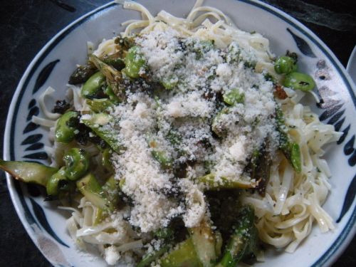 To serve, I’ve begun plating pasta dishes in shallow soup dishes that I found at Brimfield, eons ago – they turn out to be just the right shape and size for a good-sized serving of spaghetti, or in this case, fettucine with Spring vegetables. I also like to squeeze a crescent of fresh lemon over the dish after the vegetables and before freshly grated parmesan cheese is provided on top.