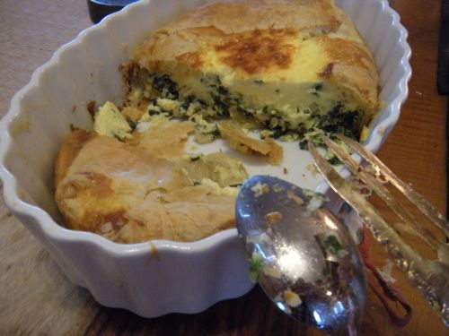 In a skillet, I sauteed some chopped shallot in butter, then added the spinach and cooked it down, adding a couple twists of grated nutmeg. Drained the spinach, chopped it up and layered it on the puff pastry sheet. A handful of shredded swiss cheese was sprinkled on top. Since the baking dish wasn’t very big, I beat four organic eggs with about a half cup of heavy cream, adding a pinch of sea salt. Once I poured the eggs into the quiche, I folded the pastry crust over the top, leaving room for the eggs to cook on their own.