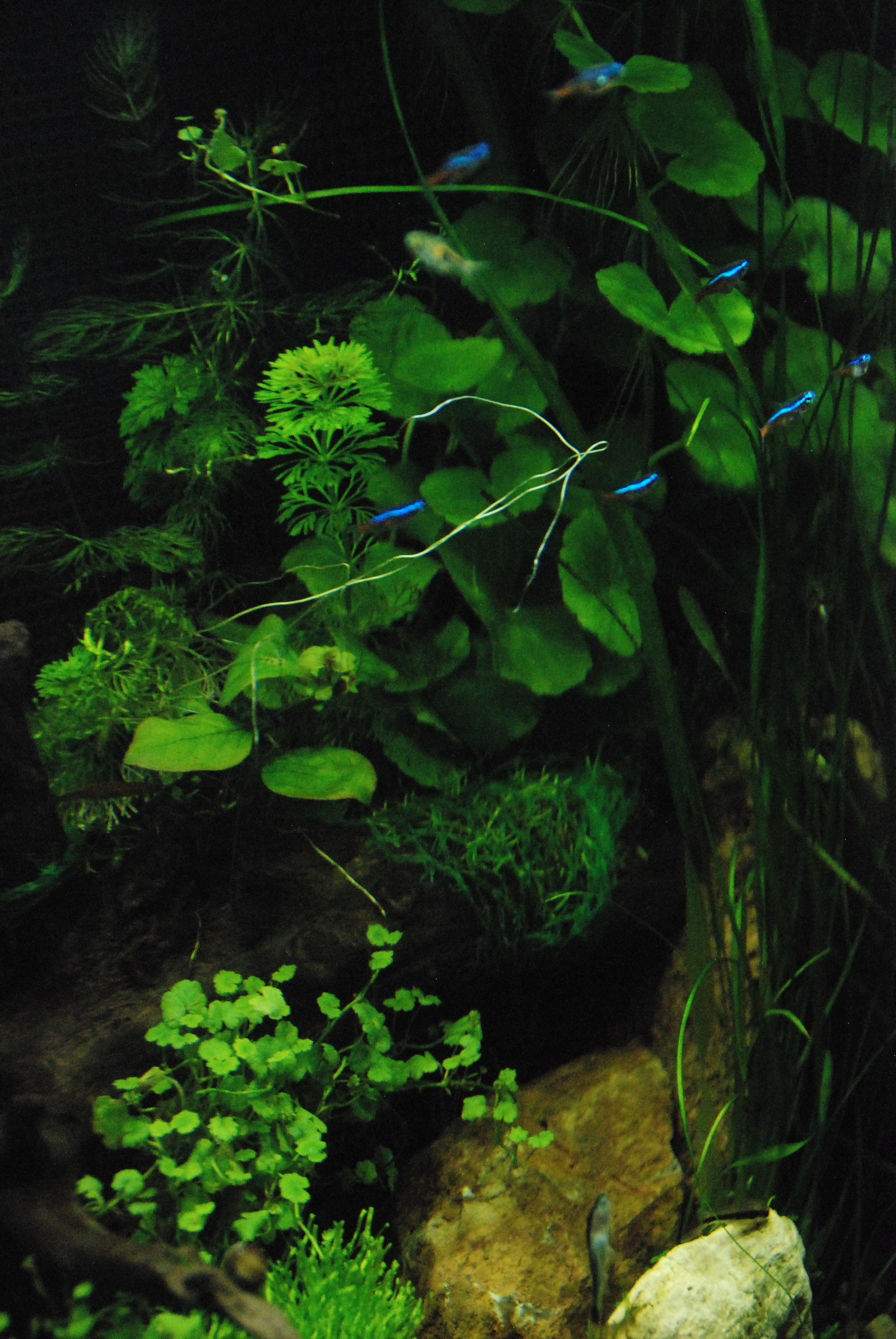 M. has been very patient since she first received this new aquarium, setting up the water filtering system, waiting to study what plants might go together, hand-tying bits of moss cuttings that will eventually grow along the back of the aquarium. She has been waiting for C. to visit before going out together to buy a knife-ruffle fish last week, a nocturnal vision (youtube clip) that is amazingly graceful to behold. This week, they were excited about going out together to buy the first neons, nine of them and some shrimp to add to the acclimating tank.