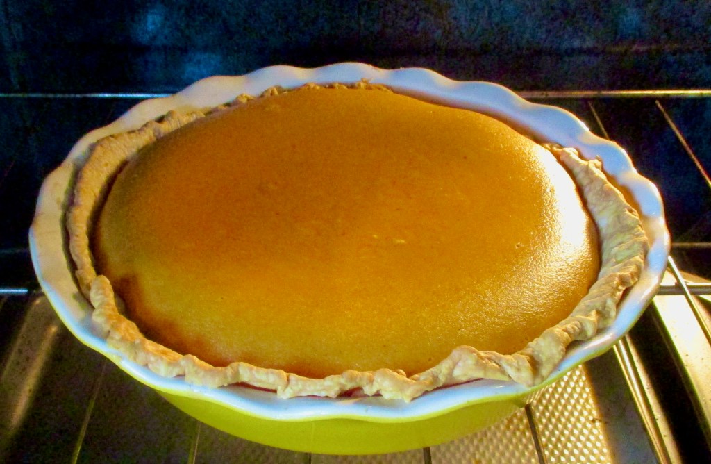 As for the pie, I made it this morning to space out the cooking effort, using a Pepperidge Farm pie crust, rolling it out so it would fit my large pie plate. I sprayed it with PAM first, laid out the crust, crimping the edge and filled it with ceramic pie beads on top of parchment paper after pricking the crust with a fork. I baked it for about 25 minutes in a 375 degree oven. While the crust was baking, I used a mixer and beat together 8 oz. of Philadelphia cream cheese with a cup of sugar (1/2 white; 1/2 brown) until the cream cheese was smooth. Beat in 2 extra large eggs, vanilla and a 15 oz. can of pumpkin puree, a dollop of molasses, a large teaspoon each of cinnamon, nutmeg and ground ginger and 1/2 teaspoon of salt. Added 1/2 cup of heavy cream and blended the pumpkin mixture together. Poured it into the waiting par-baked crust and slid it into the oven for 45 min. Turned out it needed a little longer because the center was still jiggly. Left it in for another 10 minutes, then turned off the oven; opened the door and let the pie sit in the oven for 10 more minutes.