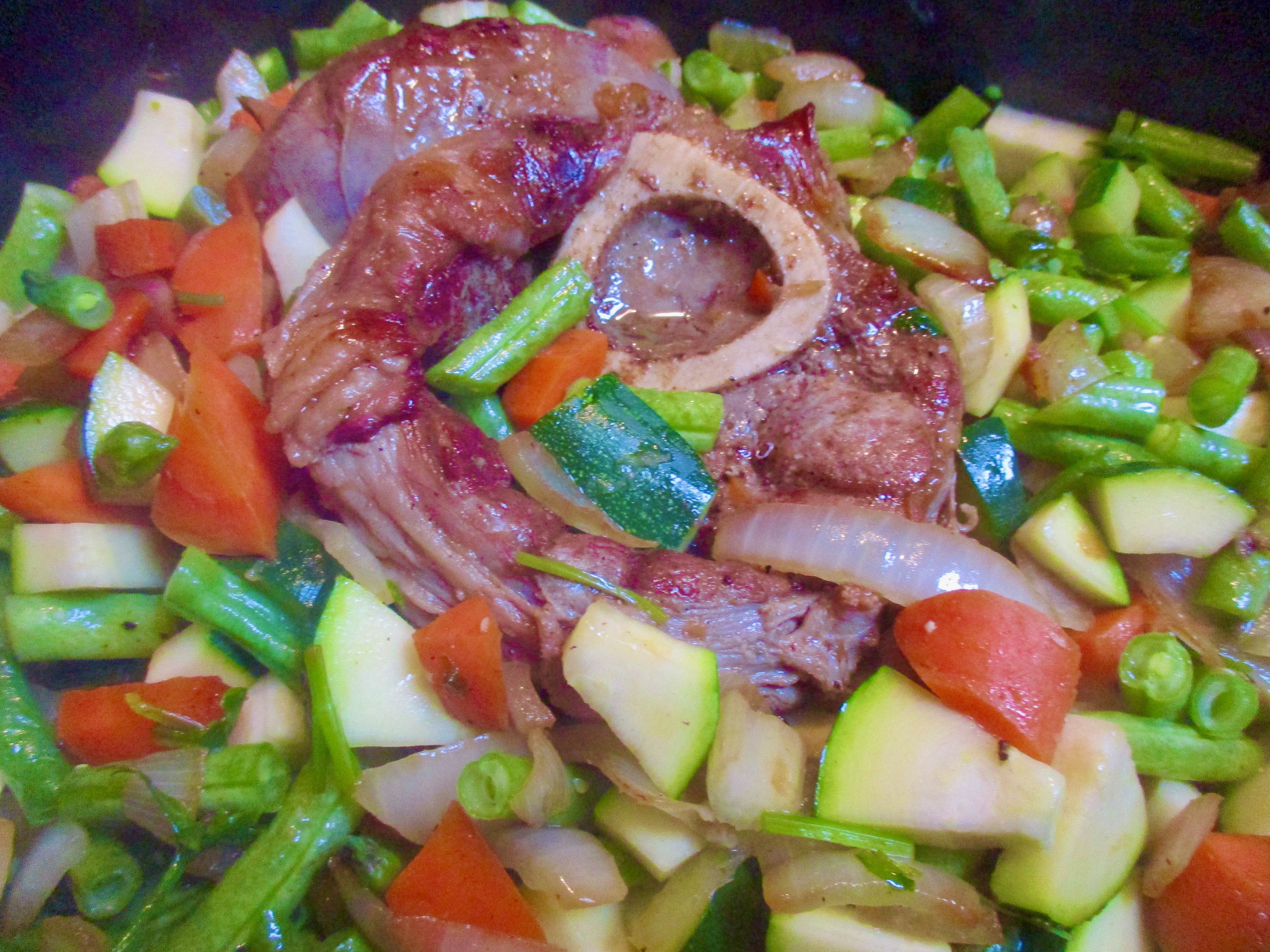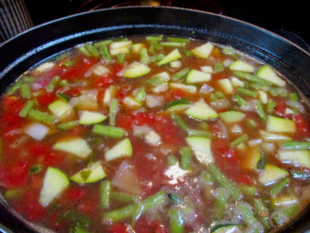 SNOWSTORM SOUP! Making a big pot of my vegetable beef soup for us to eat during the Nor-easter we’re supposed to get starting tonight and tomorrow. Here’s the basic recipe: 1) brown a beef shin in vegetable oil 2) add chopped vidalia onion, carrots, celery, green beans, zucchini squash and any veggies in the fridge that would go well; 3) add 2 cans of Hunt’s diced tomatoes (with oregano, etc.); 4) add 4 cans of filtered water; 5) add one Knorr beef gelatin pak. Simmer all day.