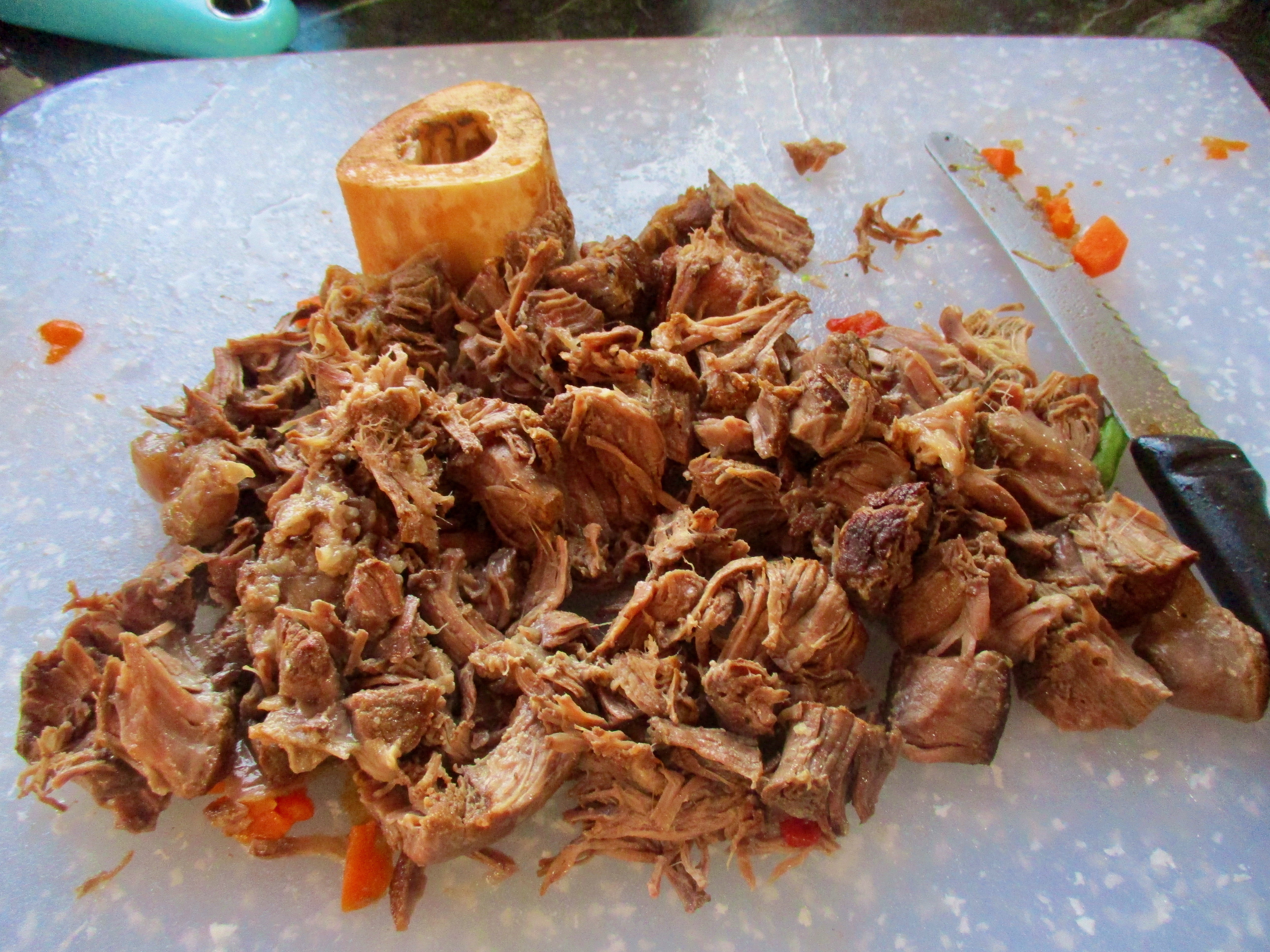 When the beef shin is cooked through, I take it out and cut up the beef pieces, discarding the cartilage and the bone. Add cut up potatoes mid-way and fresh cabbage at the end. Taste for whether the broth is too bland and add more Knorr beef gel if needed.