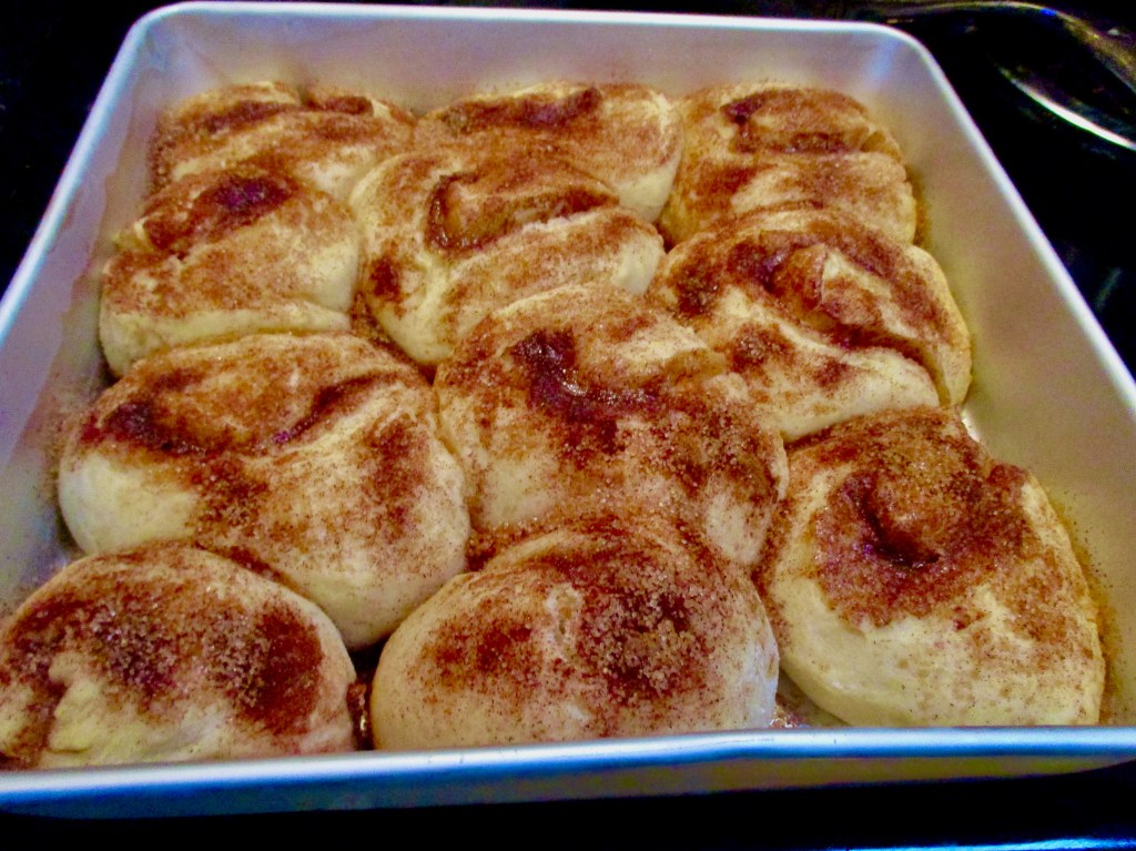 7/8 cup warm water1 package yeast1/4 c. granulated sugar1/2 Tb. salt1/2 egg unbeaten (I just use a bantam egg)2 T. soft butter3 cups flour Mix the water, yeast, sugar, salt and egg, with the butter. Stir it well. Add flour and mix well. If too wet, add a handful of flour. Knead lightly and smooth into a ball.Let it rise, covered with a cloth. Knead it down lightly and form into a ball. Cover with plastic wrap andstick it in the fridge on Christmas Eve. In the morning, knead the dough down – add a little flour if needed.Shape into a rectangle and brush with melted butter. Sprinkle with granulated sugar (I use raw sugar) and cinnamonRoll up the wide end and seal the edge. Cut into roll size and lay them out in a buttered pan. Set them a little apart so they have room to rise.Before baking, brush the tops with more butter and sprinkle with more cinnamon sugar.Heat the oven to 375 degrees and bake 20 min. or until they’re golden brown and cooked through.