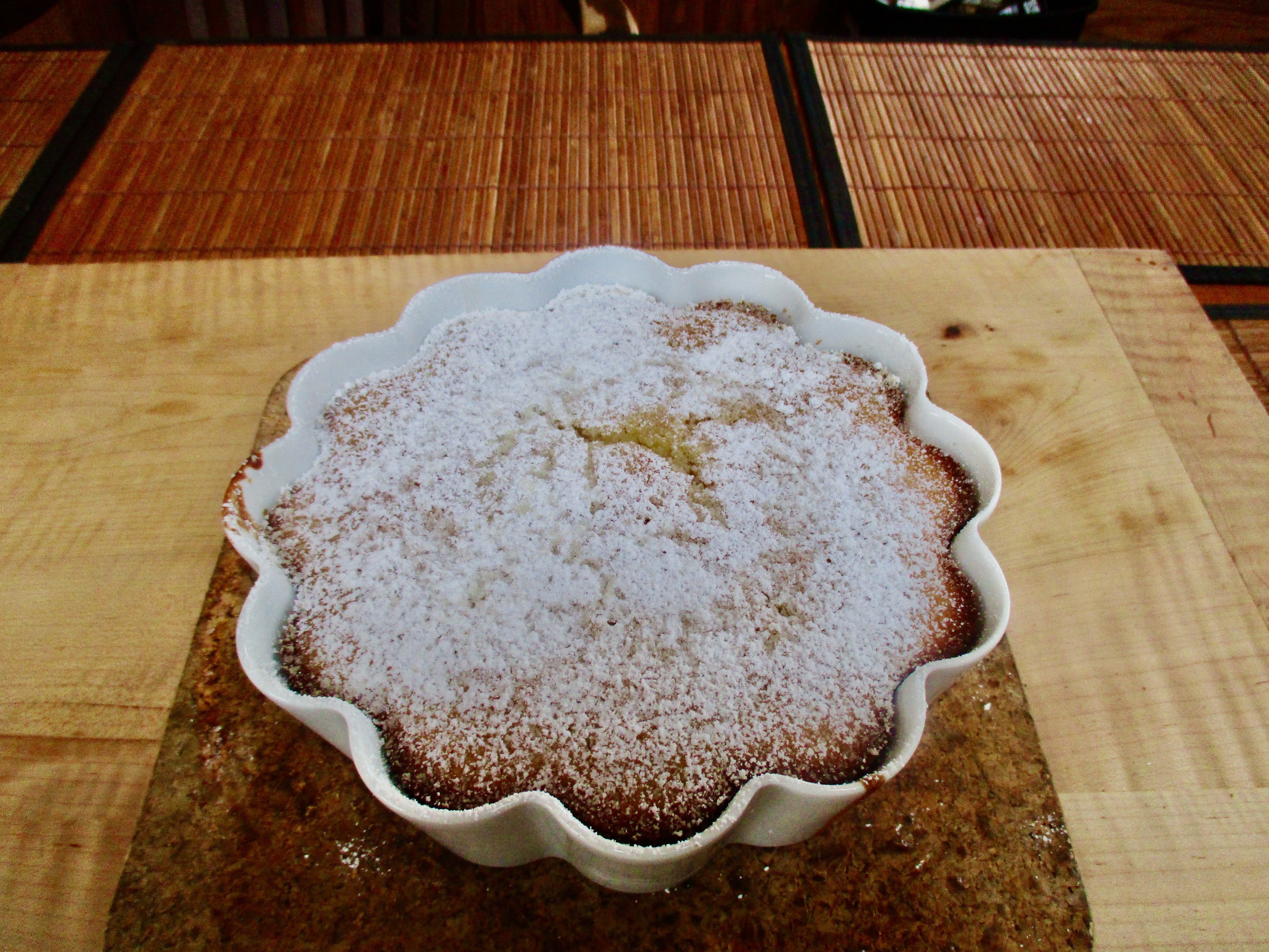 Melt 1 stick unsalted butter; using a mixer, add 1 1/4 c. sugar (I used sugar in the raw) 2 room temp eggs, lemon zest, 1/3+ cup of fresh lemon juice, same amount of buttermilk; 1/2 teaspoon vanilla, 1/2 teaspoon salt; 1 teaspoon baking powder, 1/2 teaspoon baking soda; 11/2 cups of flour. Mix well; grease a small pan and bake at 350 for 35-45 minutes until a toothpick comes out clean and the cake is golden brown. Shake some confectioners’ sugar on top. Good served with fresh fruit too!