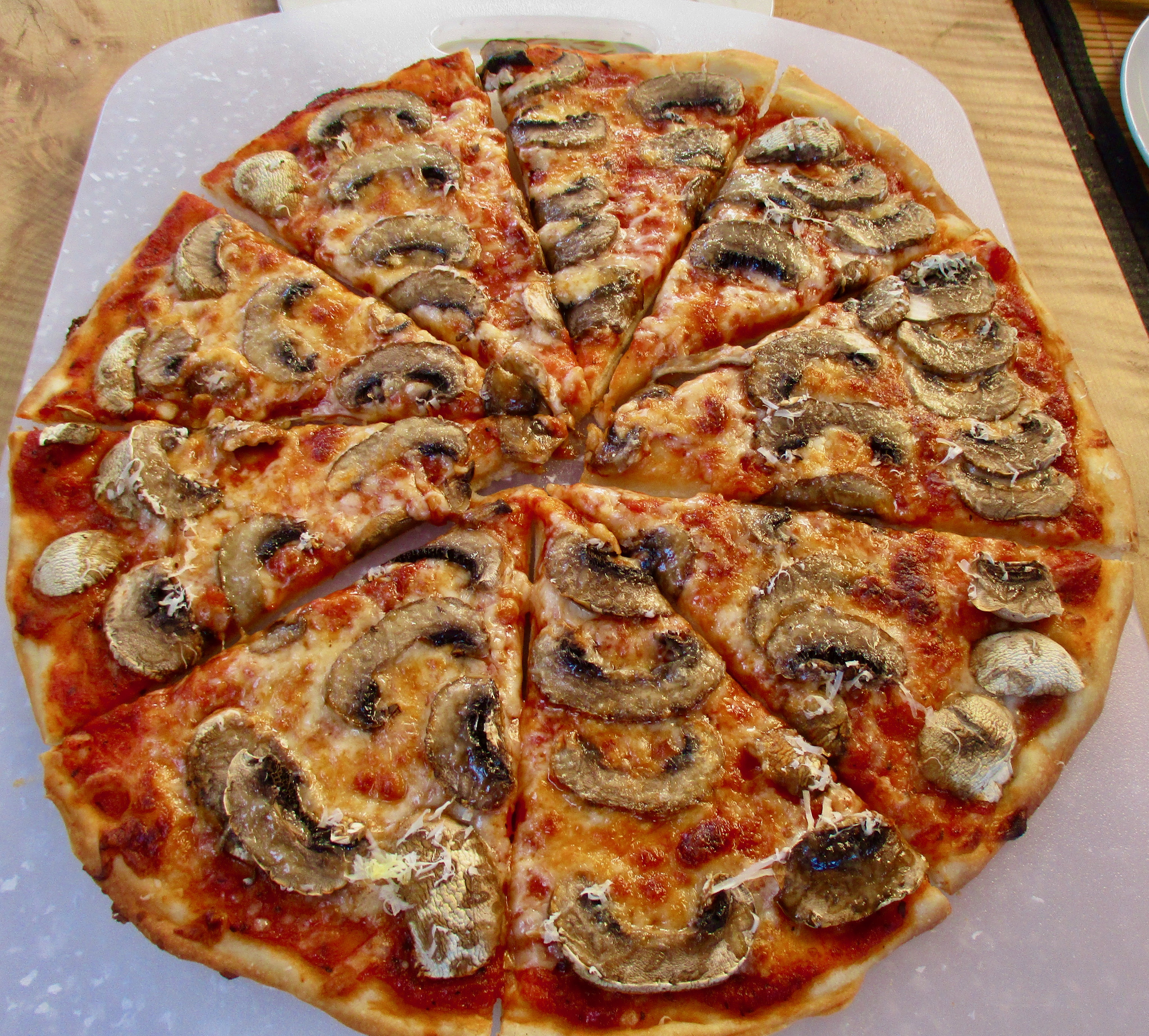 Here it is: a) Combine 1/3 cup warm water with a heaping teaspoon of dry yeast; 1/2 tsp. salt; 2 tsp. vegetable oil, 1 cup +/- of flour. That’s it; knead it gently and let rise for about an hour. Spray the pan with PAM and spread out the crust until it reaches the edges. With a big spoon, put some pizza sauce on top, barely covering the crust. Lay on some mozzarella cheese, sliced mushrooms and freshly grated parmesan cheese. Bake at 425 for about 15-20 min. until the bottom crust is golden. Then, I turn on the broiler to finish cooking the top. Be sure to peek at the crust bottom to make sure it’s cooked enough. Place the pizza on a cutting board and cut into wedges.