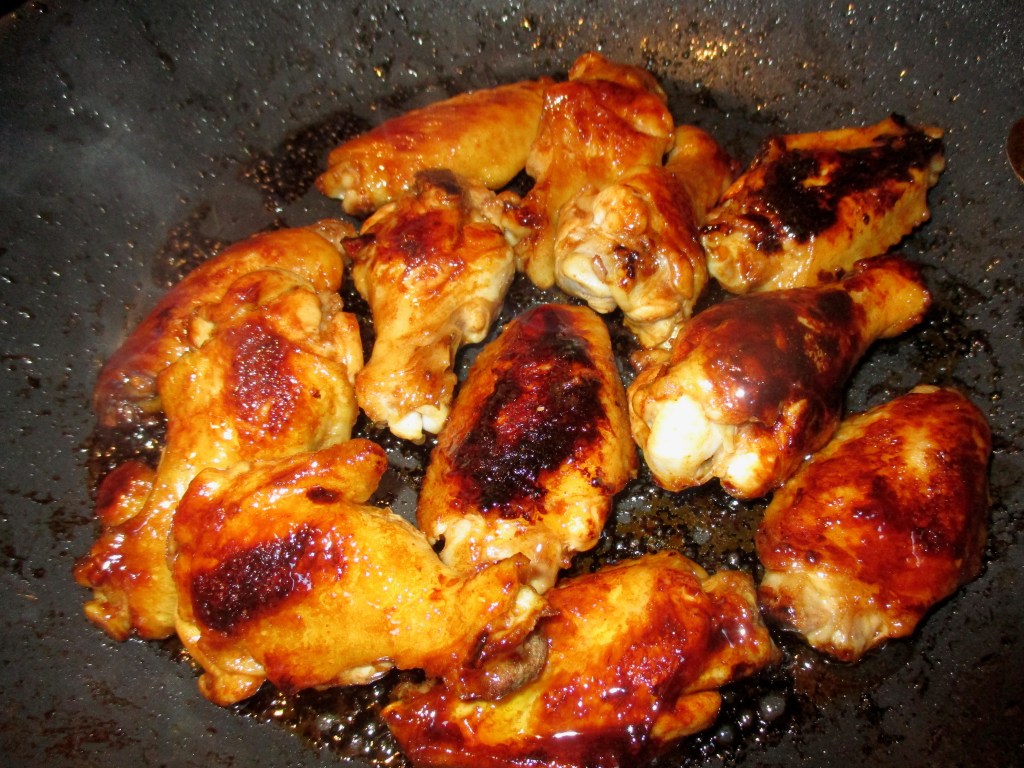 Cooking ahead for dinner tonight: I made barbecue chicken wings according to the pan cooked recipe by Jacques Pepin but changed the sauce that went on top of the cooked wings. In a dry non-stick skillet, I placed the wings, underside down and browned for 10 minutes. Turning them over, I made sure to move them around and to brown the second side well. In a bowl, I mixed together Osawha organic soy sauce, Chinkiang black vinegar and a healthy glug of honey. I stirred that together with a tablespoon of Siraicha sauce. When the wings were cooked on both sides, I brushed on the marinade with a basting brush and made sure there was enough to drip down in the skillet to cook both sides at once. I turned them over to even out the glaze/browning step. And here they are! If you’d like to make them crispier, I guess you could run the pan under the broiler before serving. Don’t think they need it though.