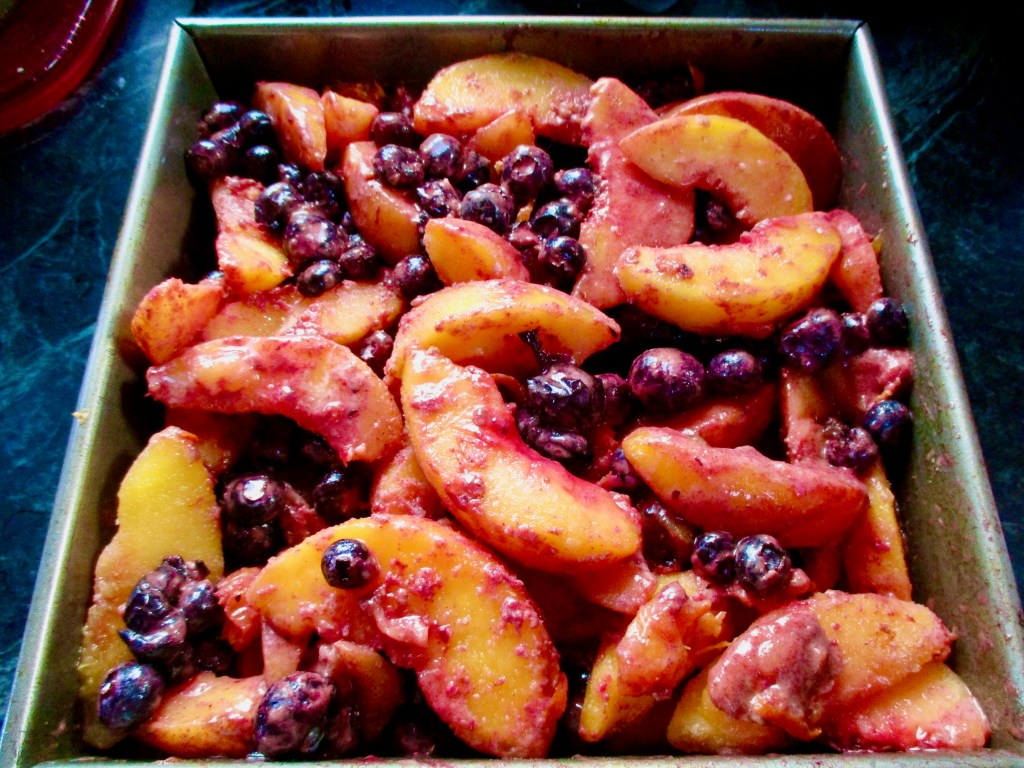 I used a pack and a half of frozen peaches and a pack of frozen blueberries. To the fruit, I added 1/4 cup brown sugar, 1/3 cup flour, 1/4 cup cornstarch, generous shakes of cinnamon. Let it defrost in an 8″ square baking pan.