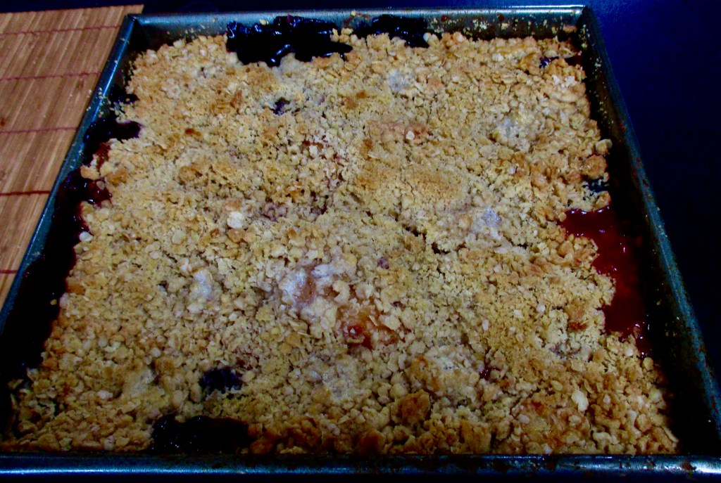 For the topping, I used a pastry cutter to mix a stick of unsalted butter (cold) to 1/2 cup flour, 1/2 cup Quaker rolled oats, 1/4 cup light brown sugar. When the mixture was rough crumbs, I added it to the top of the fruit.