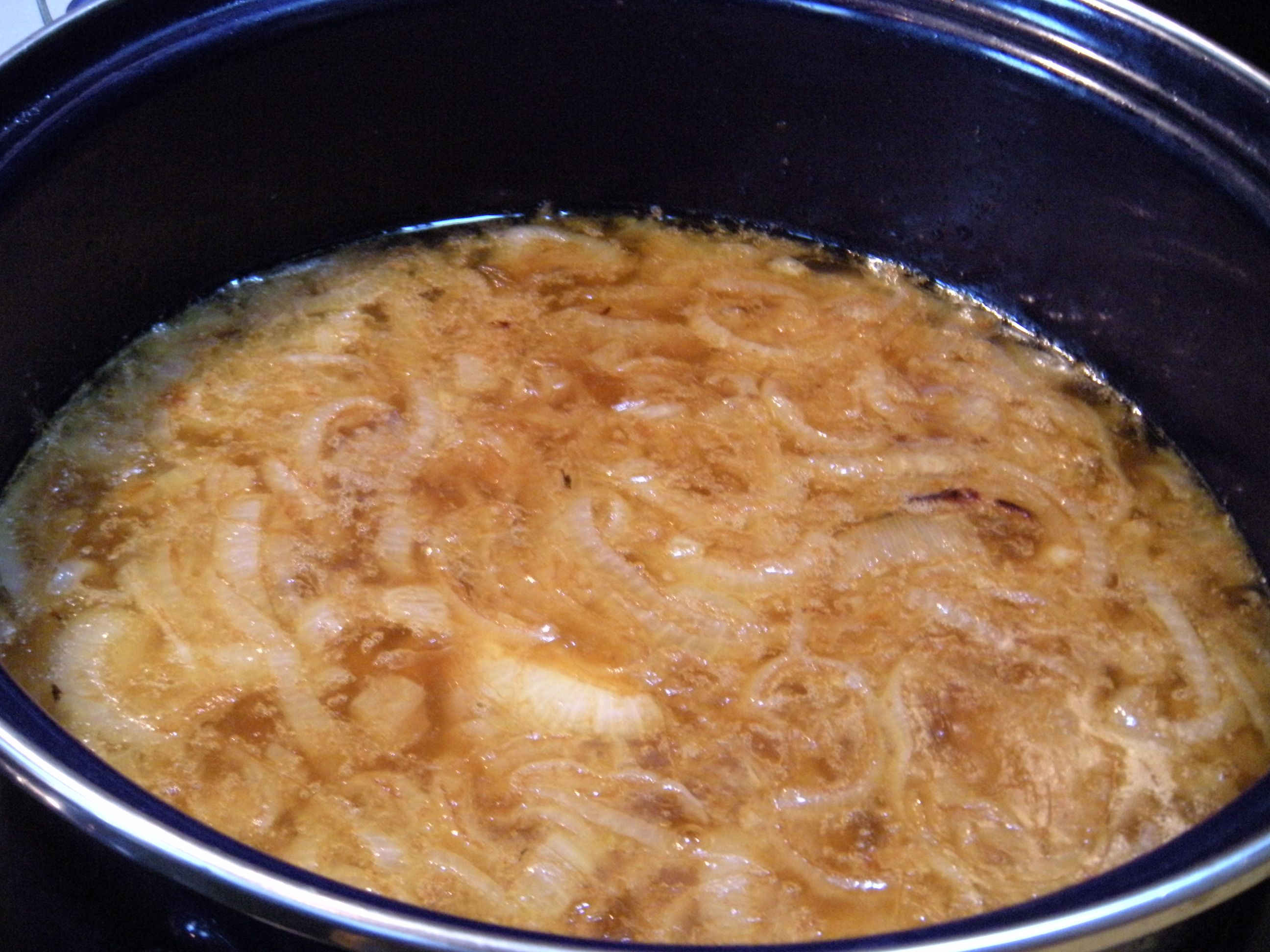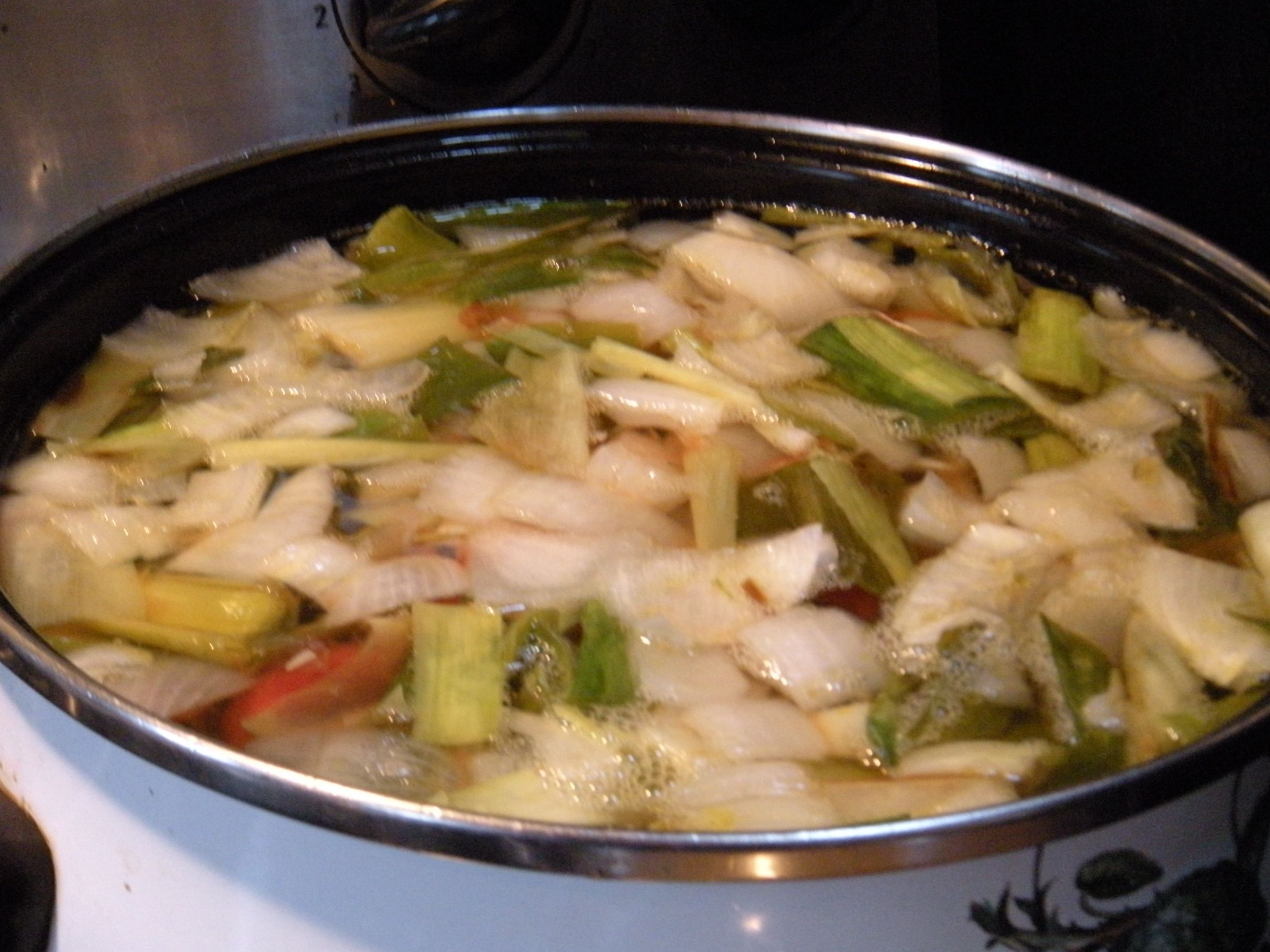 Leaning towards a veggie melange, I decided not to use the frozen beef and marrow bones that I have in the freezer. Instead, I’m going for onions, carrots, celery, mushrooms, barley, broth and stewed tomatoes.