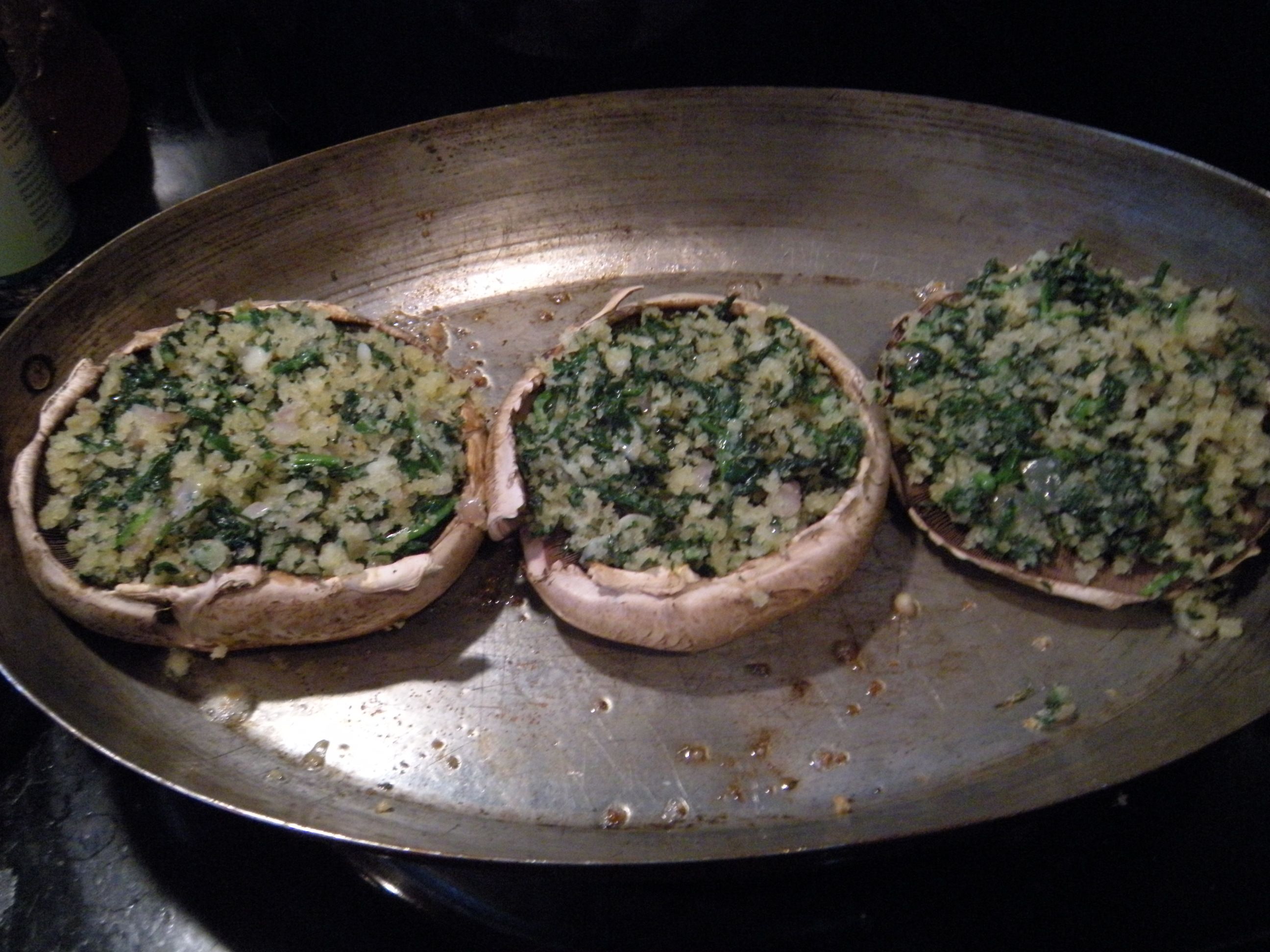 7. Spoon heavenly mixture onto three large portobella mushroom caps, underside up.mushrooms with spinach 2