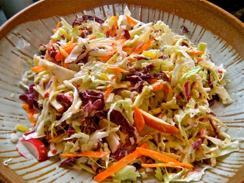 But today, I thought I’d try it because I had the ingredients on hand except for buttermilk. I looked online to see what a substitute might be and added a little lemon juice to whole milk since I only needed a tablespoon of it for the recipe. In the fridge was a fresh half of a small head of cabbage, some leftover red cabbage that I had used for an asian noodle salad, half of a carrot, half of a honey crisp apple, some radishes and scallions. By the time I had shredded the cabbage, the bowl I was going to use was obviously too small. By the time I was ready to mix the dressing with the vegetables, it needed an even larger, shallower bowl to mix it together in order for the flavors to blend.
