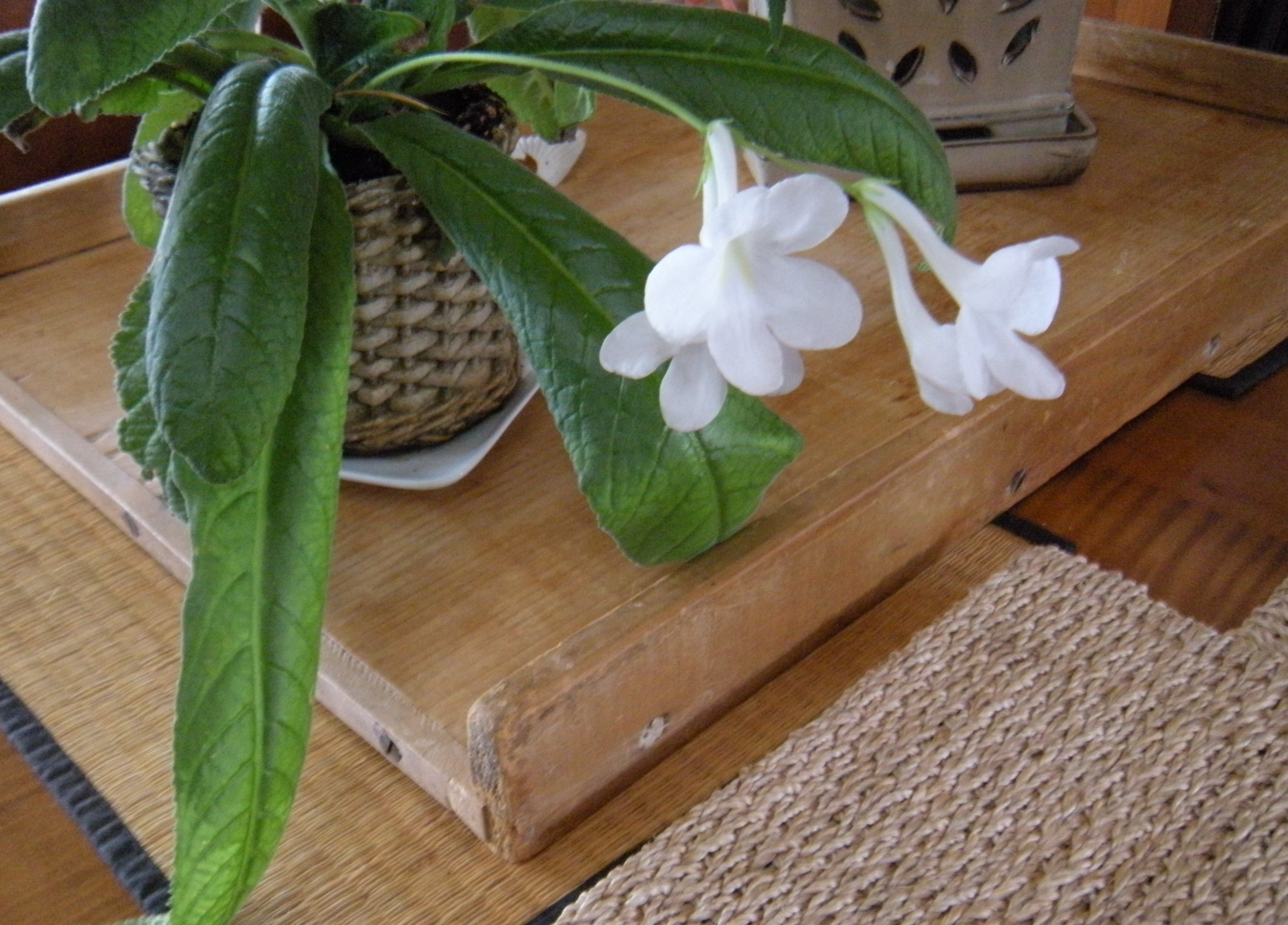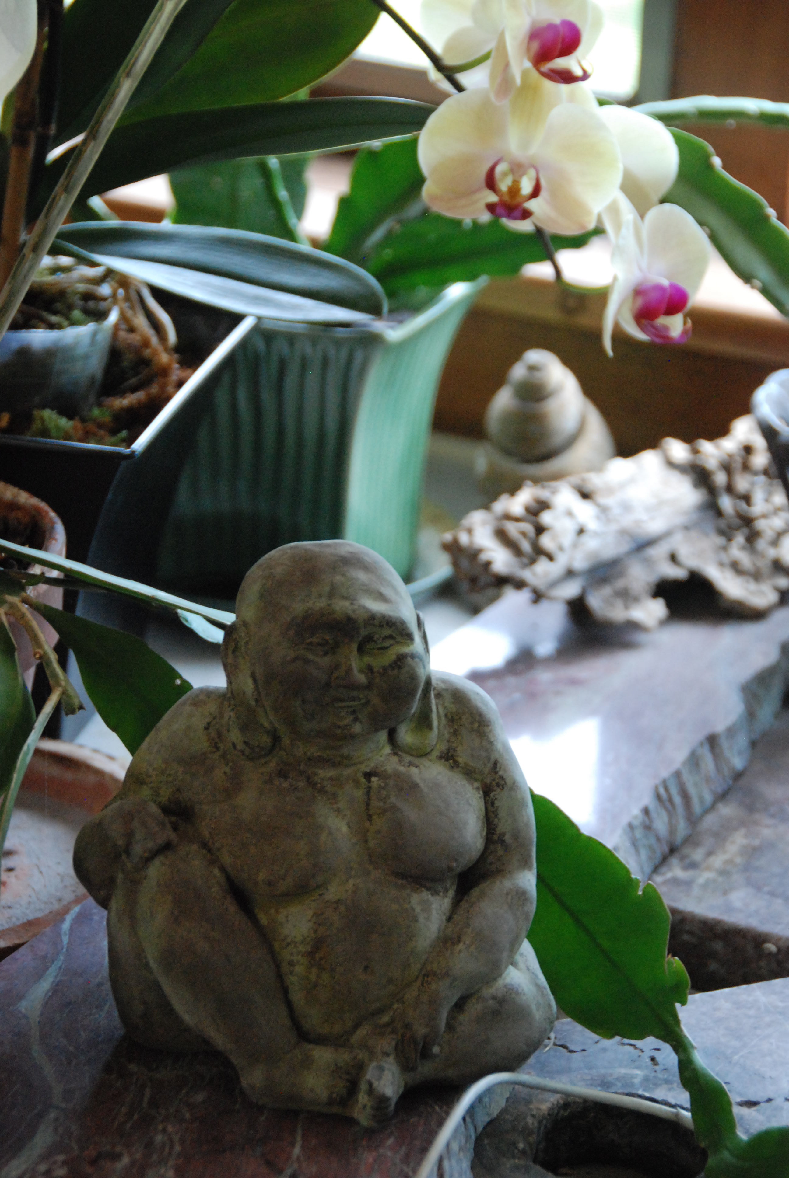 The orchid shelf needed tending so I washed it off and trimmed the plants, staging them in a way so that there was some work surface next to the early gateleg table I had decided to use for my writing table. A fat and happy Buddha found a place to sit next to the lamp. By this time, I was on a roll, so we put the old Bose system on a stand in back of the table and hooked it up. Soon, sounds of Mitsuko Uchida playing Mozart Fantasies floated through the room. We beamed at each other in satisfaction for cobbling together old computer stuff that was lying around to make this new little space for me.