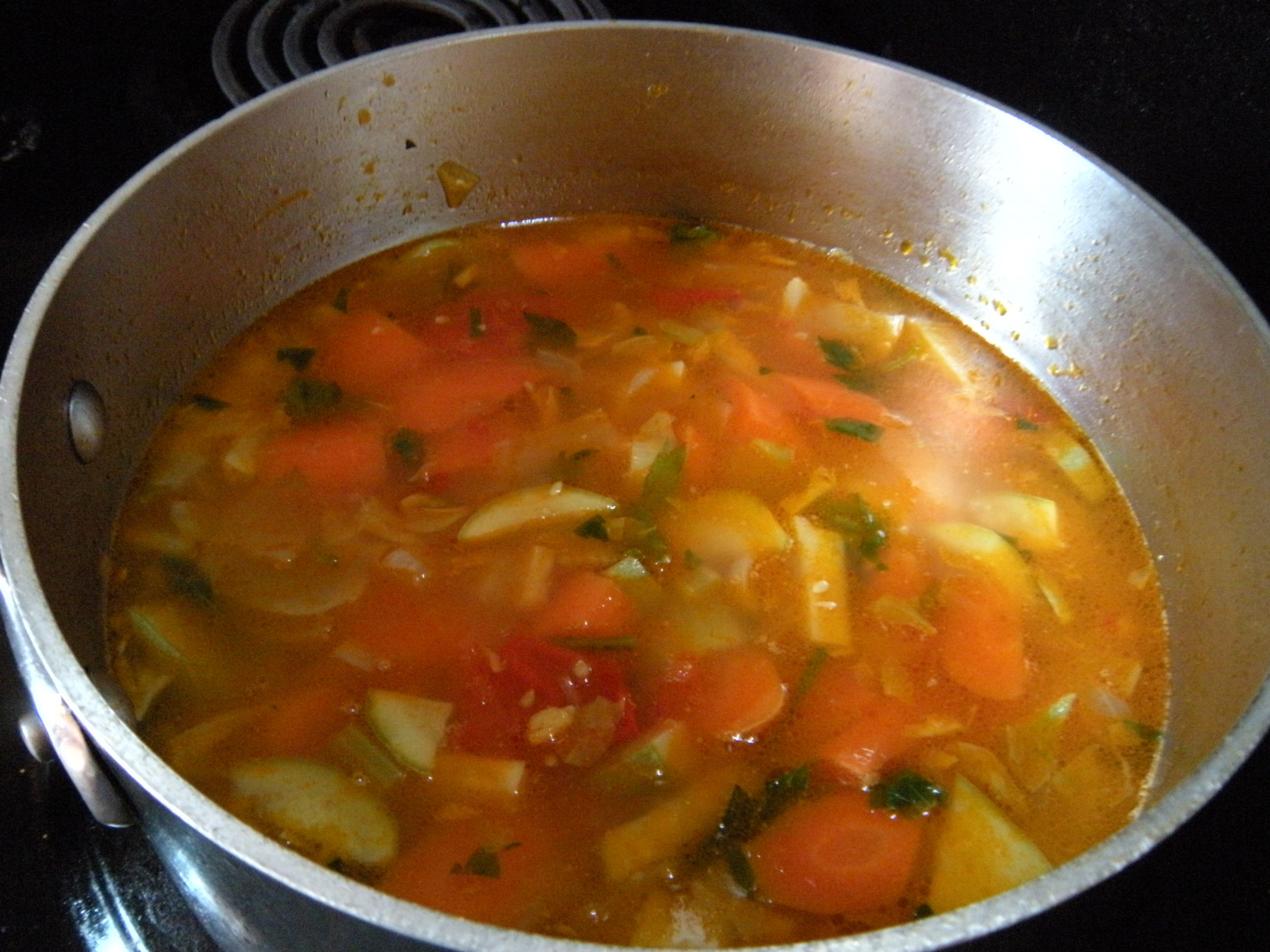 vegetable-soup-1In these turbulent times, it’s comforting to make a simple vegetable soup from whatever you happen to have in your fridge and pantry. I made a pot after breakfast this morning that is simmering on the stove right now. Here’s my recipe: