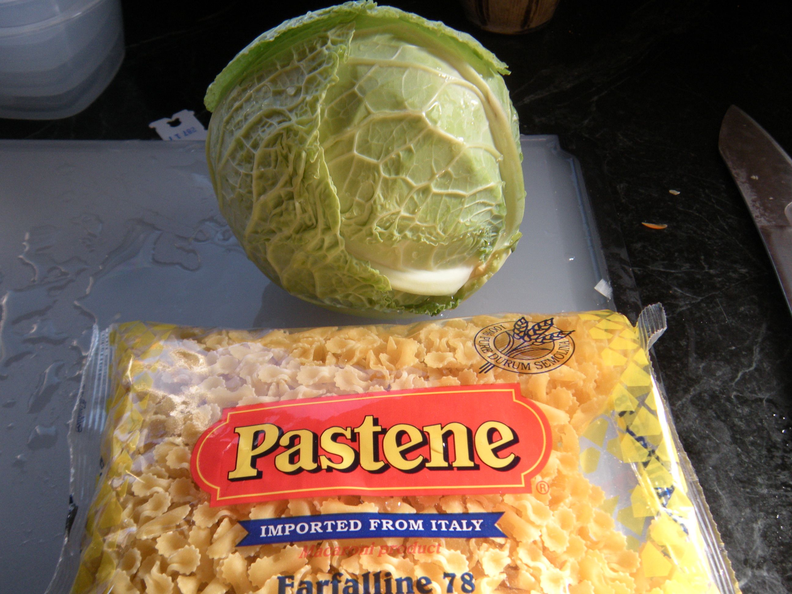 Today’s ingredients included a whole vidalia onion chopped, 4 stalks of celery, 6 carrots, 3 small summer squash (peeled and chopped,) low-sodium chicken broth, no-sodium beef bouillion, a packet of Lipton’s onion soup, a can of Del Monte no-salt diced tomatoes and distilled water to fill my very large soup pot.cabbage and farfalline